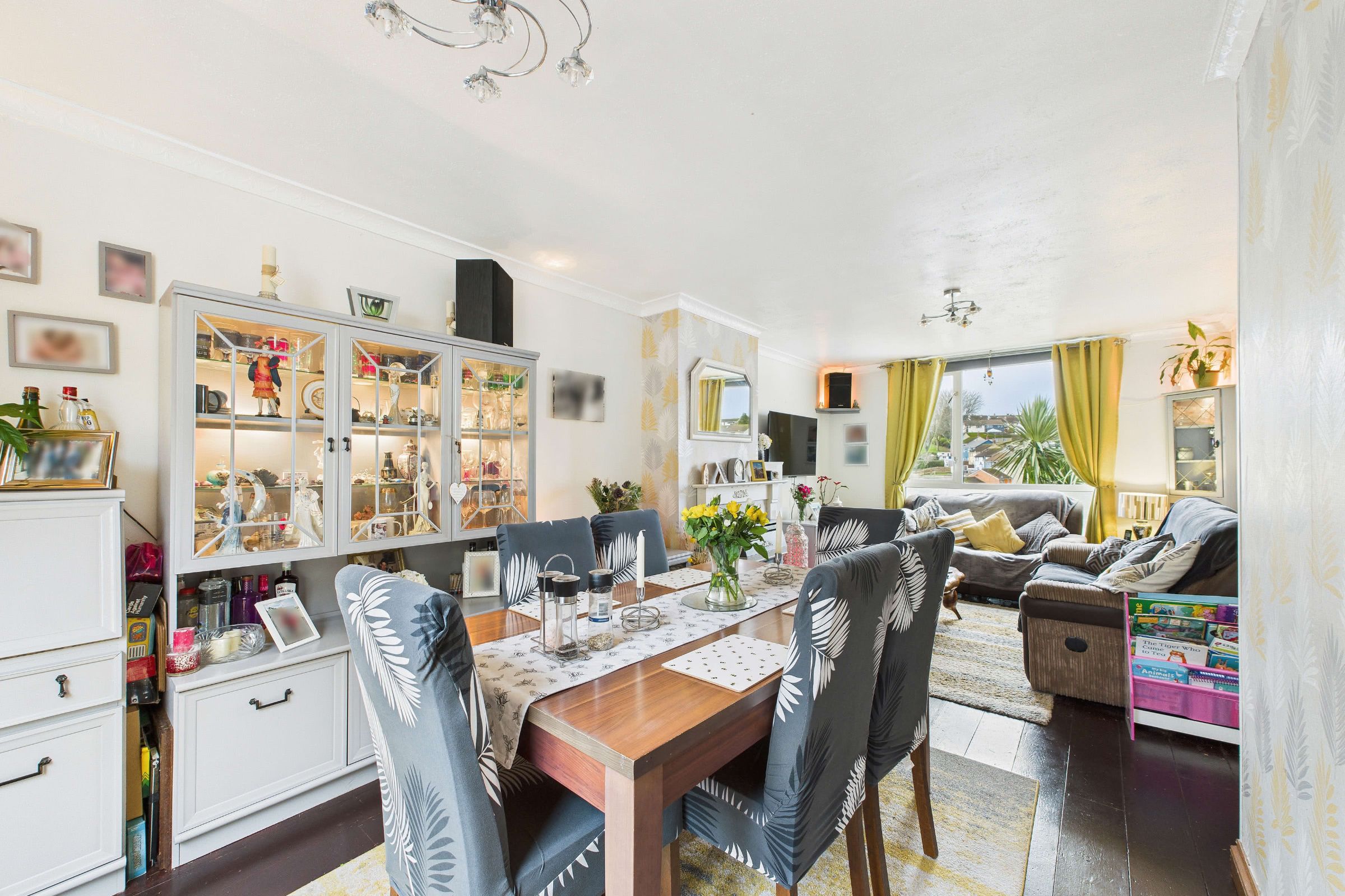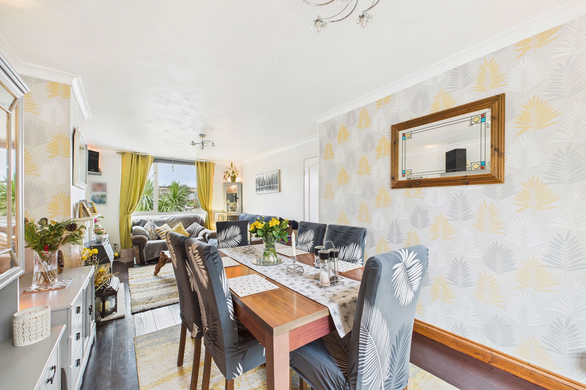 The property benefits from a well-proportioned open-plan living and dining area, creating a versatile space suited to both everyday use and entertaining. The living room is positioned at the front of the property and enjoys a pleasant outlook through a double-glazed window. To the rear, the dining area offers ample room for a family-sized dining table and is enhanced by a full-height double-glazed window, allowing for an abundance of natural light and an attractive rear aspect.