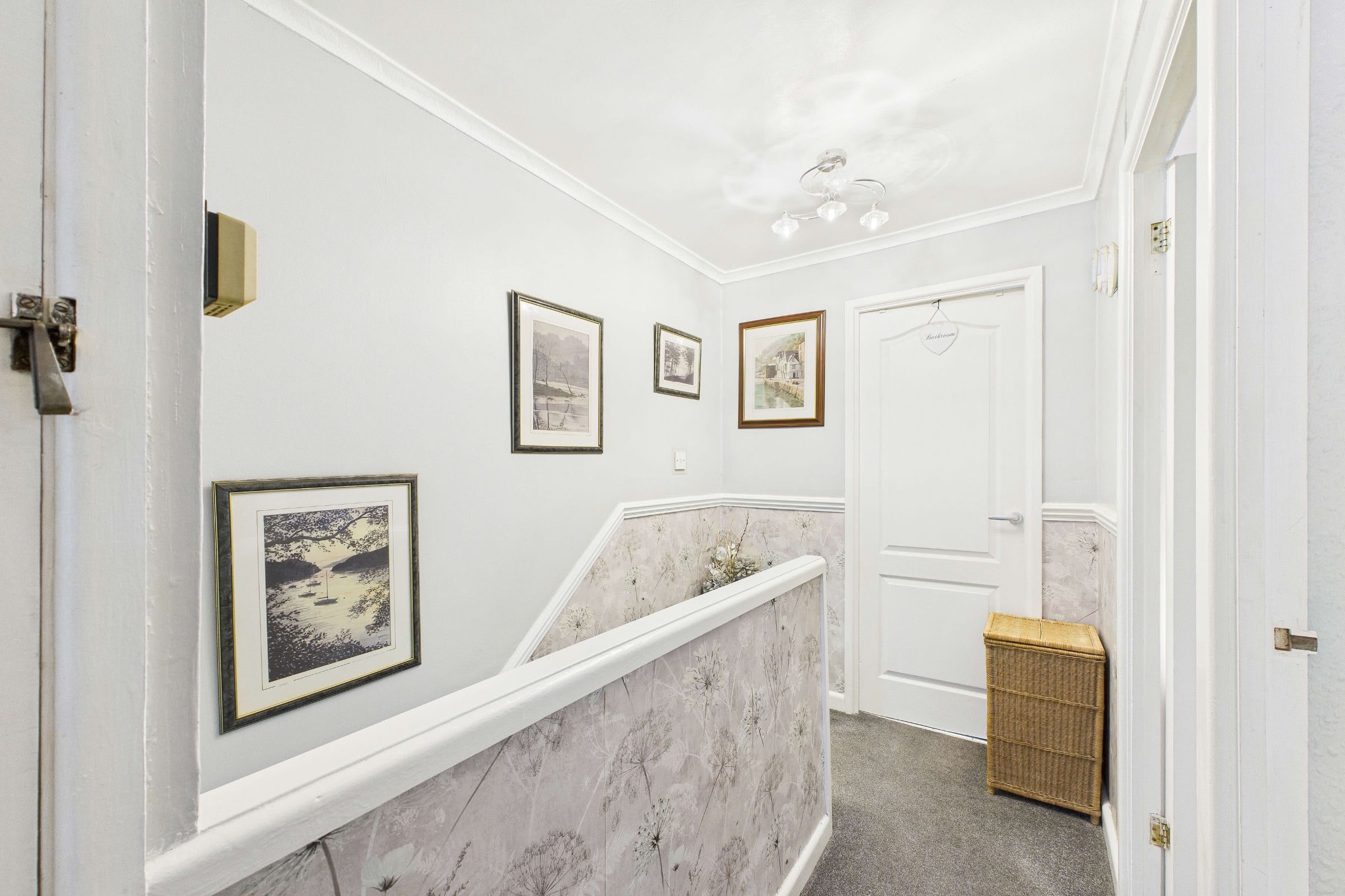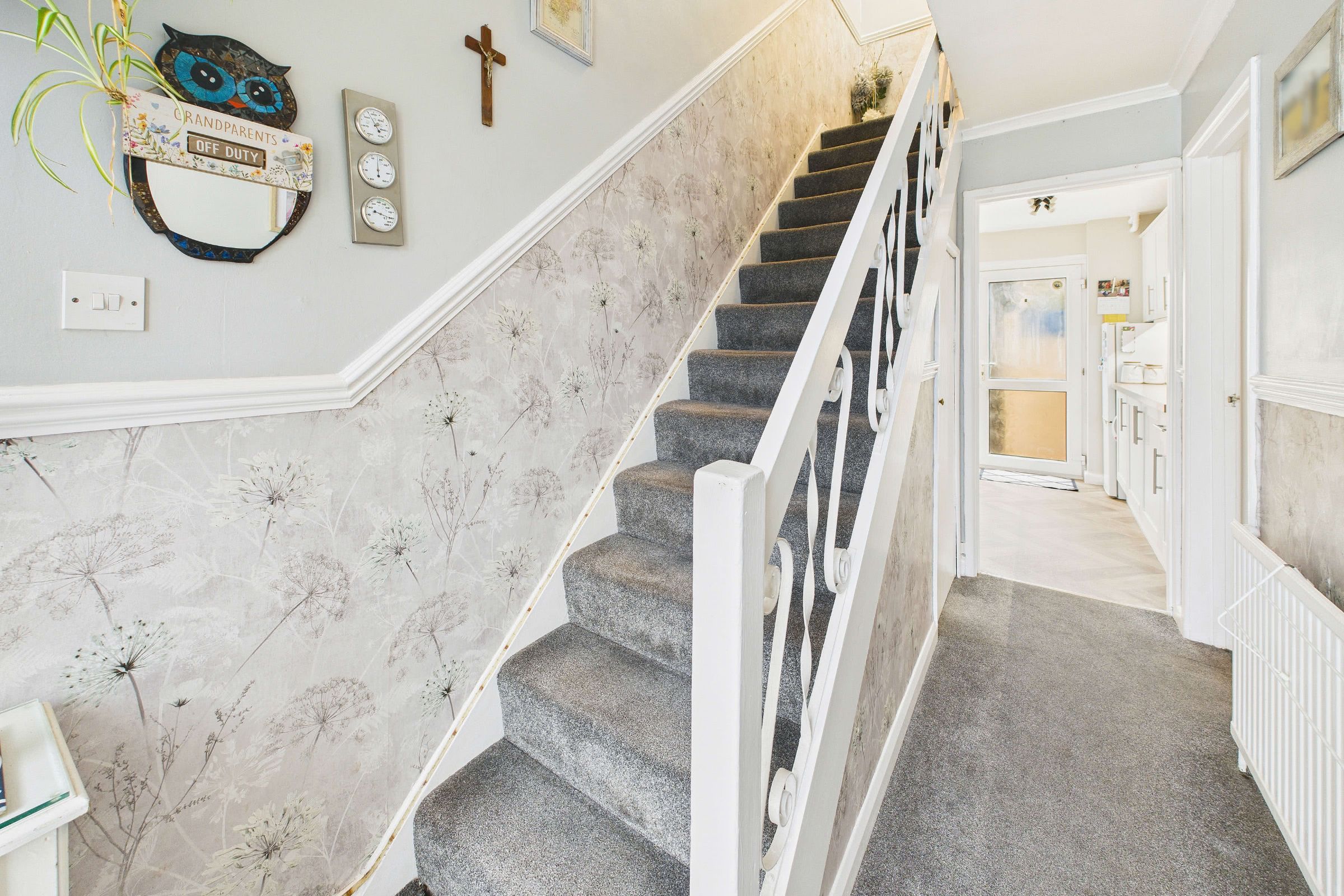 Approaching from the front, the property is set behind a tiered garden predominantly laid to lawn and enhanced by mature palms, creating an attractive first impression. A stepped pathway leads to the main entrance, where a covered storm porch provides shelter before entering. The double-glazed front door opens into a welcoming entrance hall, with a central heating radiator and a useful under-stair storage cupboard. From here, the staircase rises to the first-floor accommodation, offering a practical and well-organised introduction to the home.