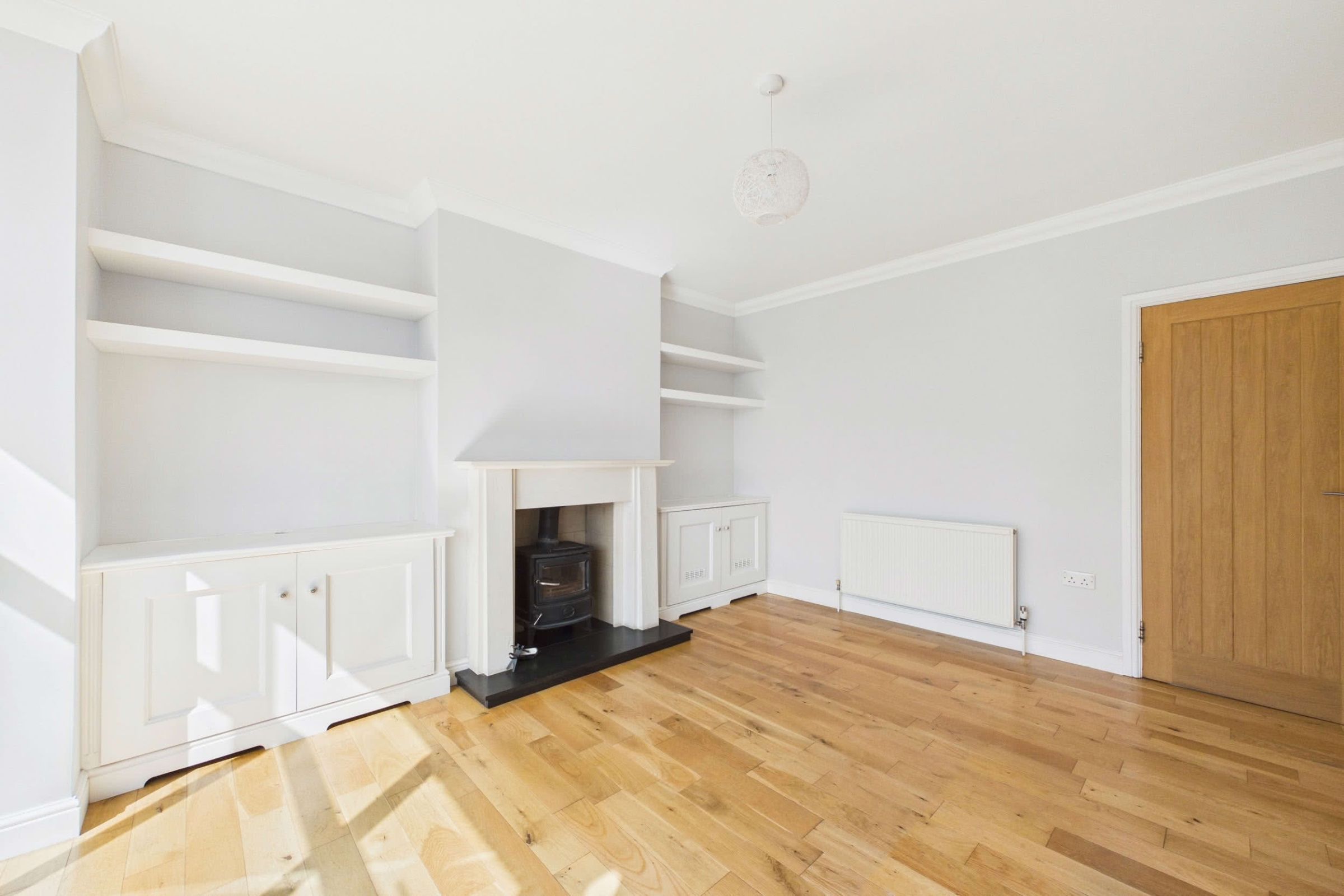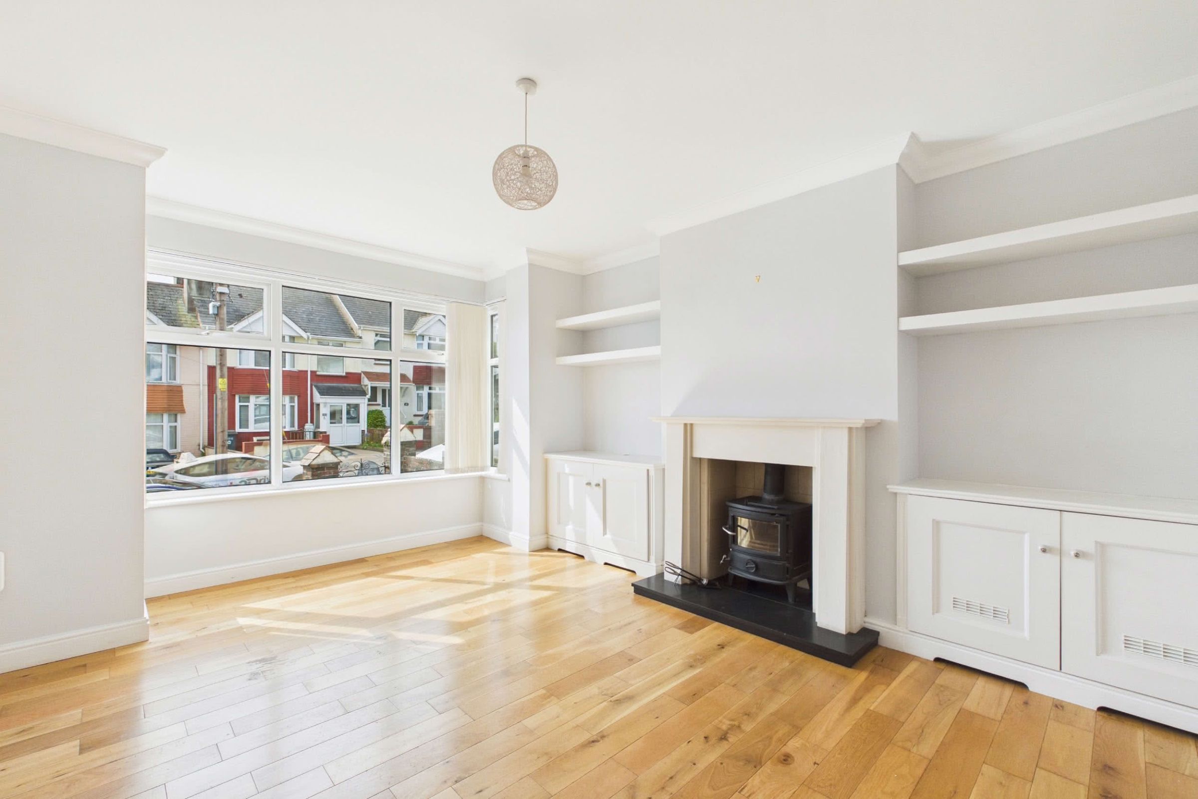 Positioned to the front of the property, the living room is a generous and inviting space, continuing the attractive oak flooring from the reception hallway. A large walk-in box bay with double-glazed windows draws in plenty of natural light and enjoys pleasant sea views. The room is centred around a chimney breast with a feature fireplace, incorporating an inset stove and a solid black stone hearth. To either side are well-designed alcoves fitted with low-level cupboards and open display shelving, providing both storage and decorative display space.