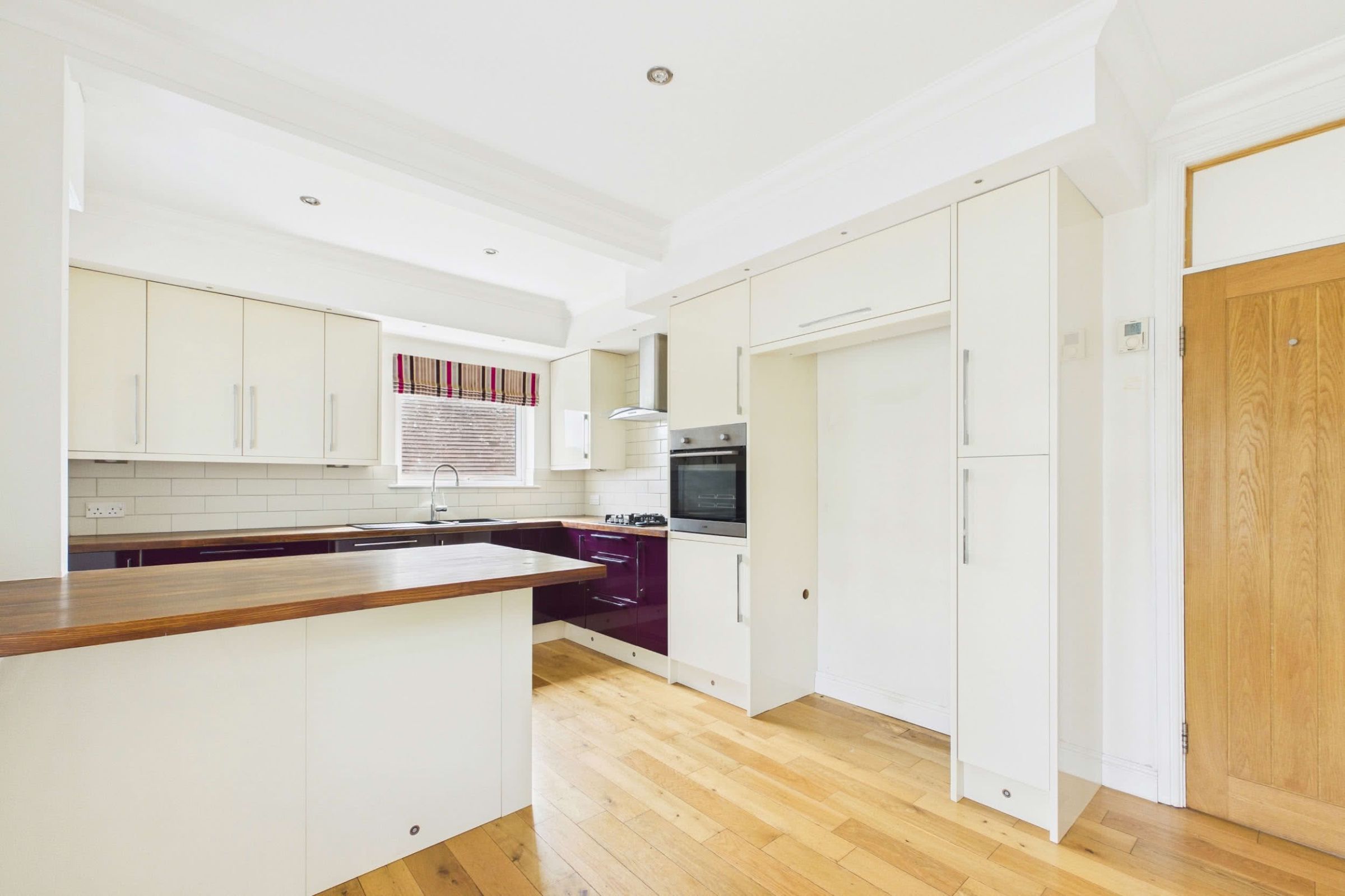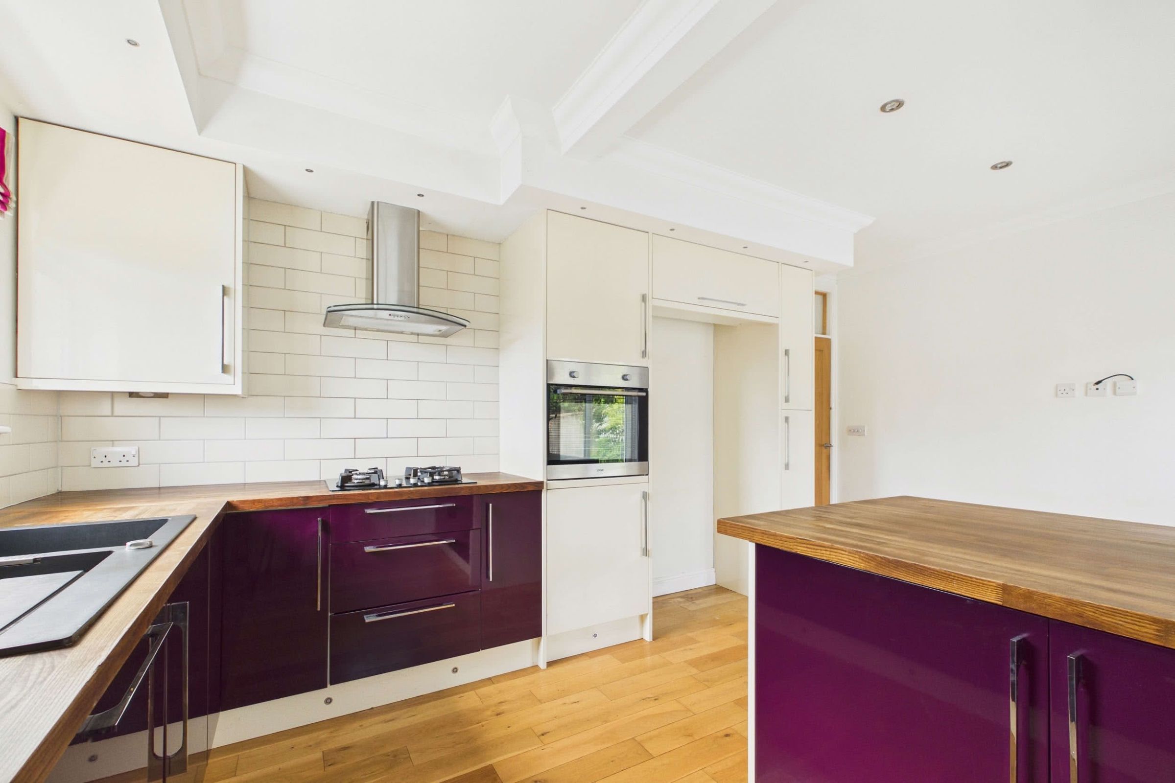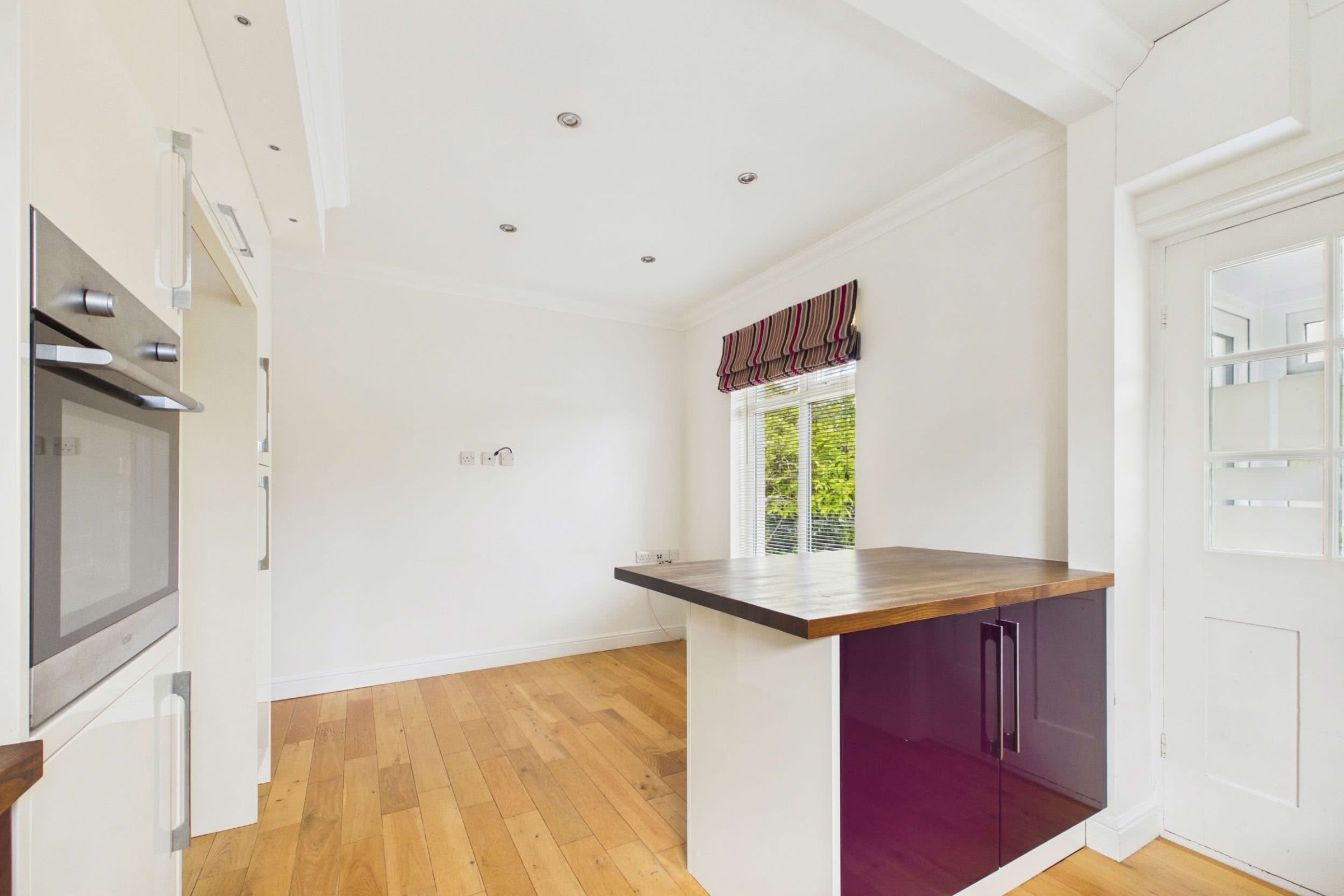 The contemporary kitchen and dining room is a stylish and practical space, continuing oak flooring and offering ample room for cooking and dining. The kitchen is fitted with off-white wall cabinets complementing contrasting plum base units, wooden work surfaces and tiled splashbacks, with under-counter and plinth lighting. A run of base units extends from one wall, with the worktop overhang creating a useful breakfast bar area, ideal for informal dining. Integrated appliances include an eye-level oven, inset gas hob with extractor above, dishwasher, and a composite one-and-a-half bowl sink and drainer positioned beneath a double-glazed side window. There is also a recess in the cabinetry providing space for a large American-style fridge/freezer. The adjoining dining area is well proportioned and comfortably accommodates a family-sized dining table. From the kitchen, an internal door leads into a rear porch, which provides access to the garden.