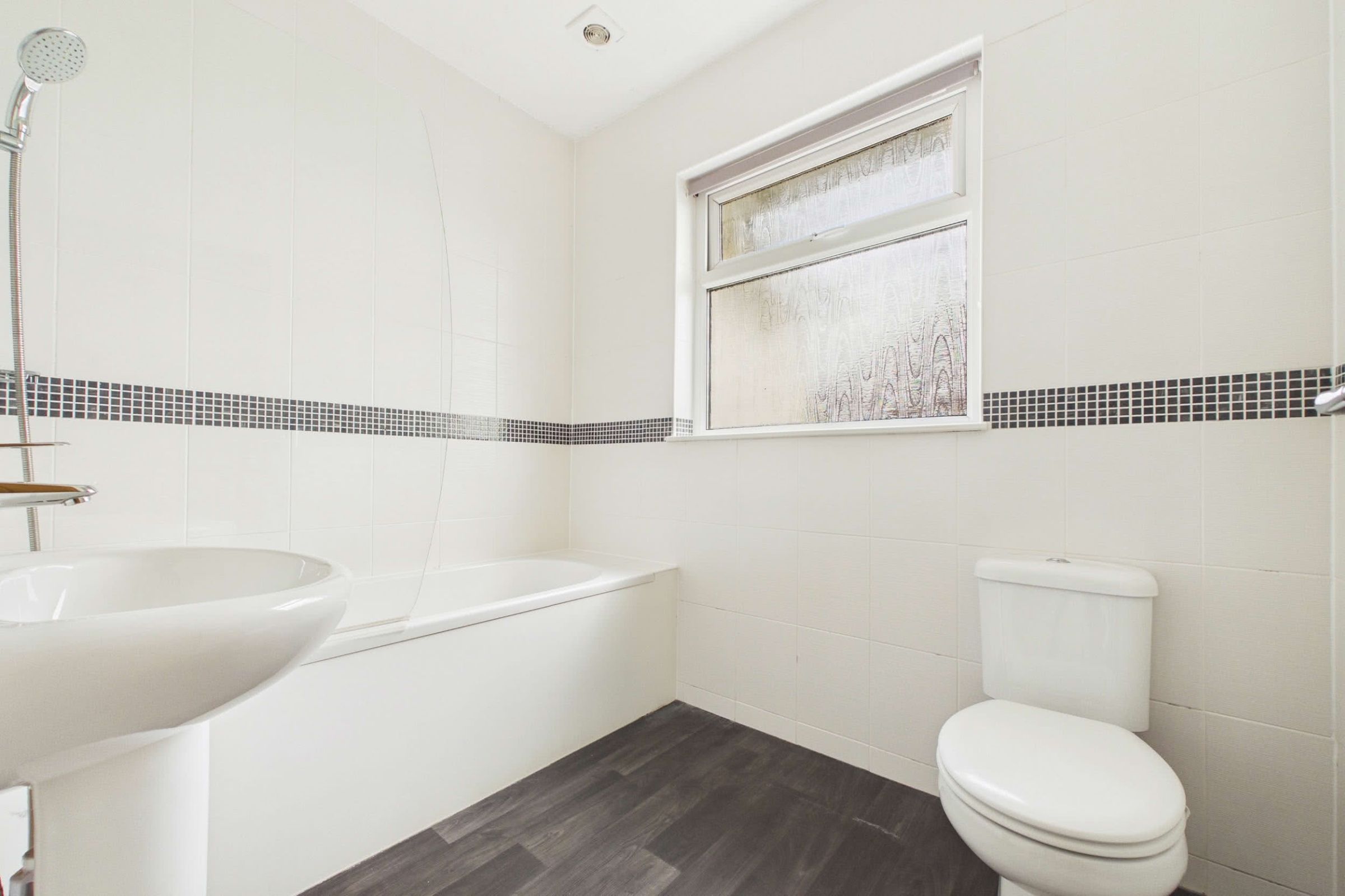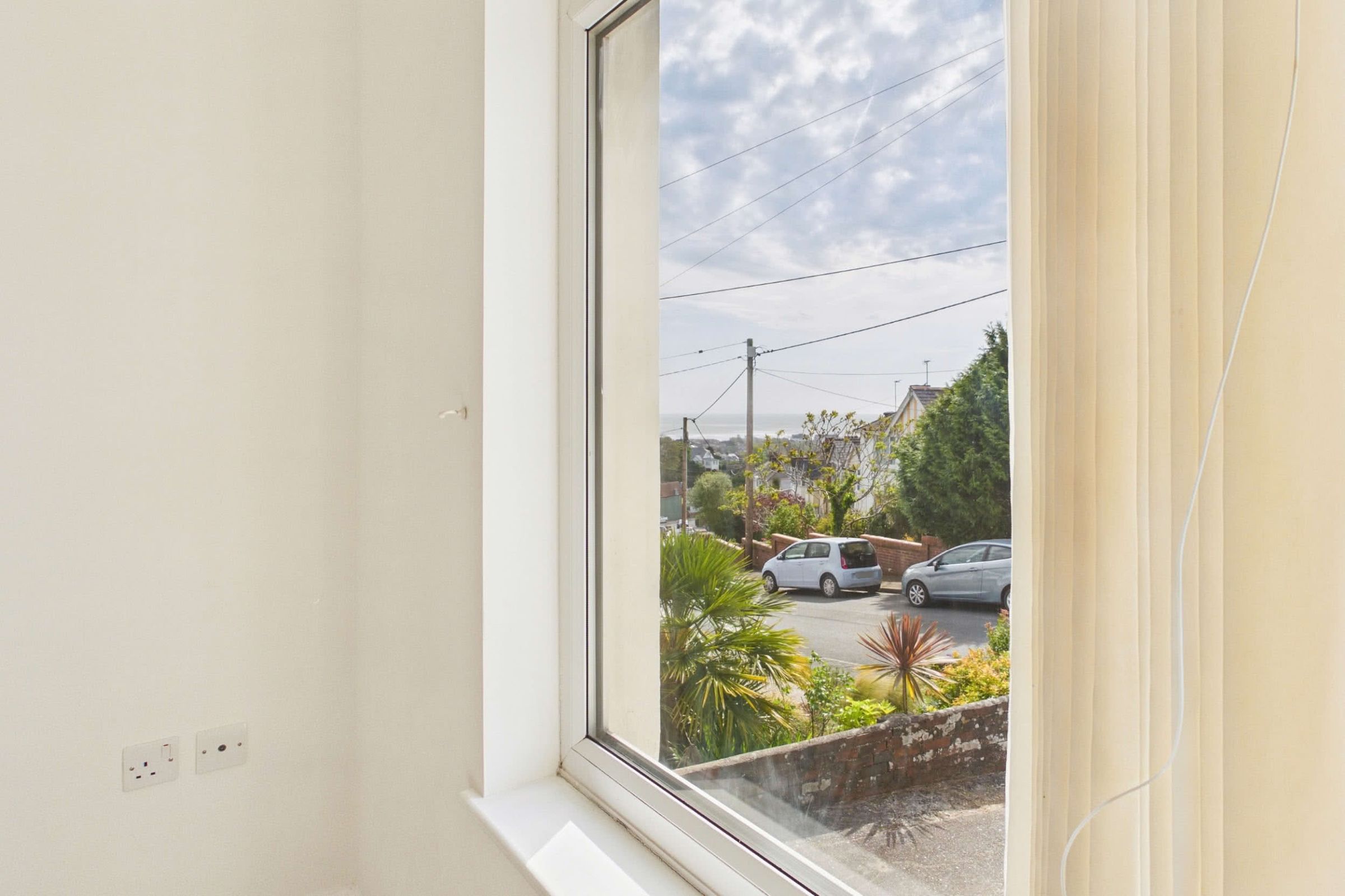 The property offers two well-proportioned double bedrooms. The principal bedroom is positioned to the rear and features a walk-in bay with double-glazed windows, creating a bright and comfortable space overlooking the garden. The second double bedroom is situated to the front of the property, with a double-glazed window enjoying pleasant sea views. Serving the accommodation is a modern family bathroom, fitted with a bath and mains-fed shower over, pedestal wash basin and low-level WC. The walls are finished with tiling, with additional features including a wall-mounted heated towel rail and an obscure double-glazed window providing natural light.
