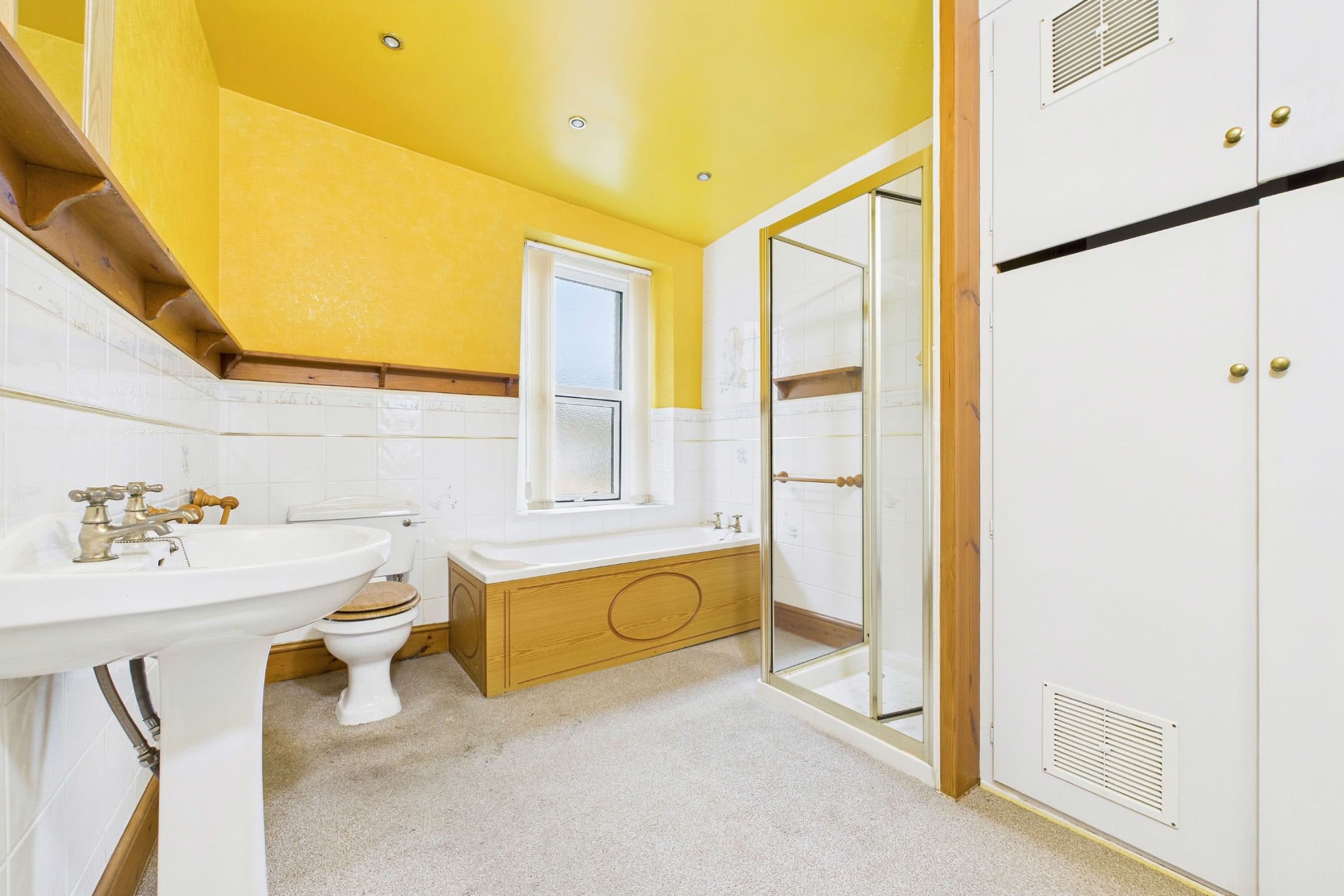 Upstairs there are two double bedrooms and an impressively sized four-piece bathroom, complete with a corner shower enclosure, bath, WC and basin, and a built-in cupboard housing the gas combination boiler.