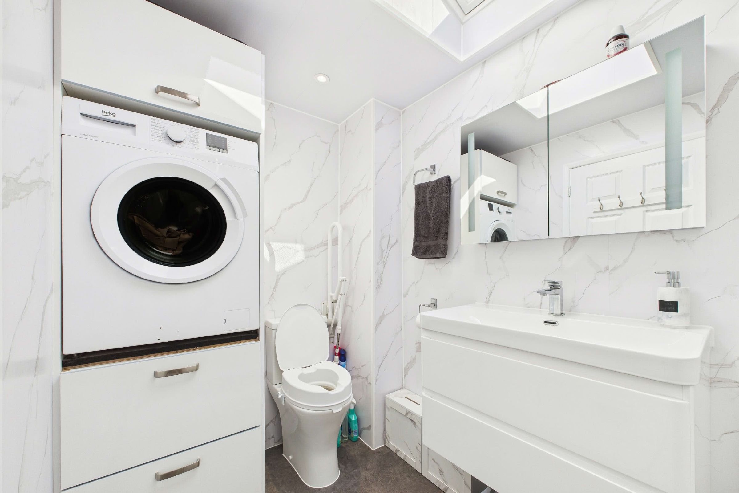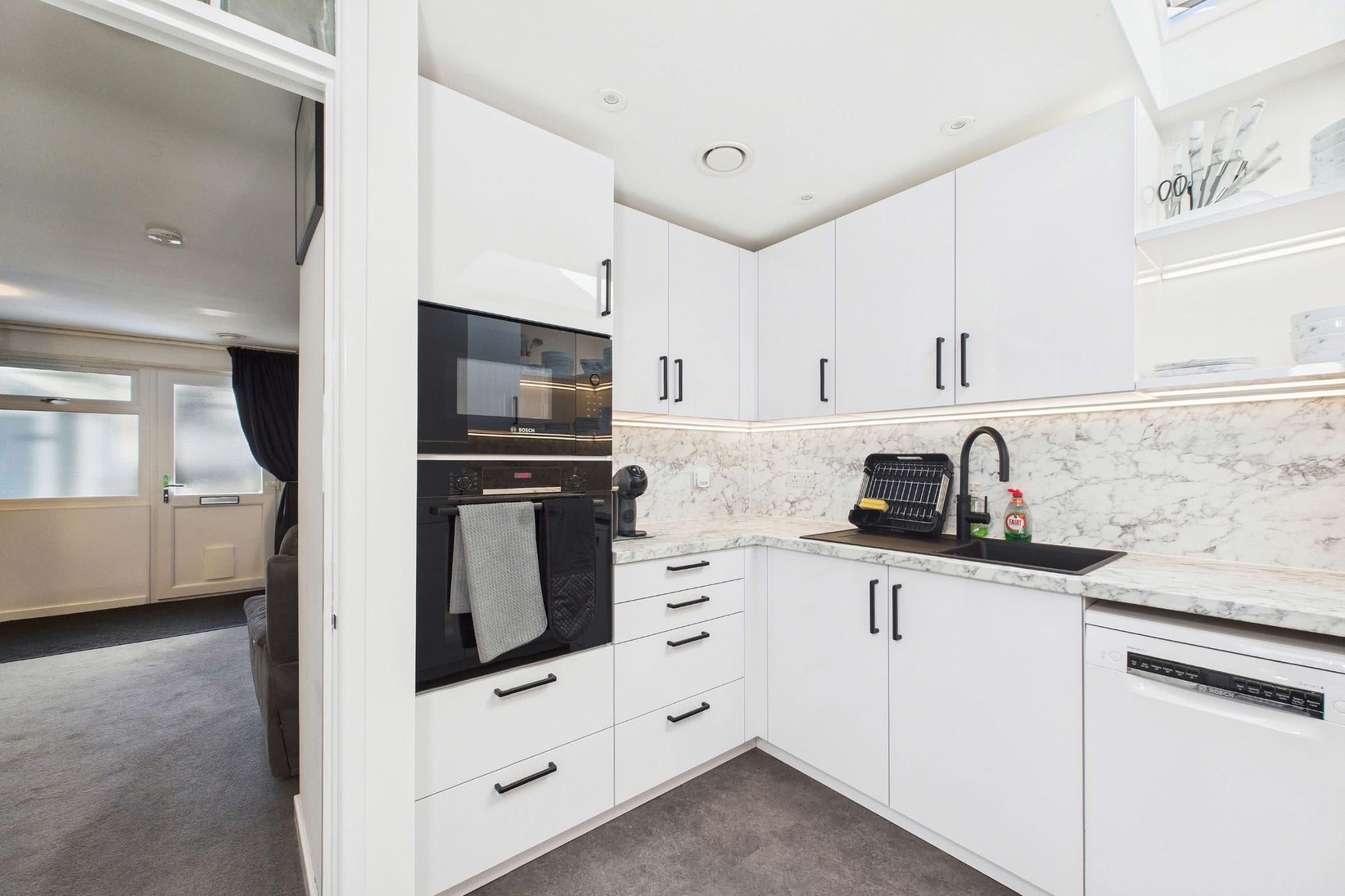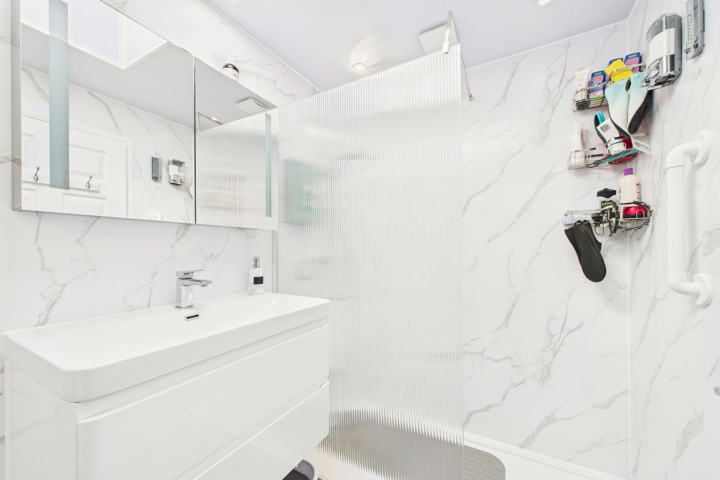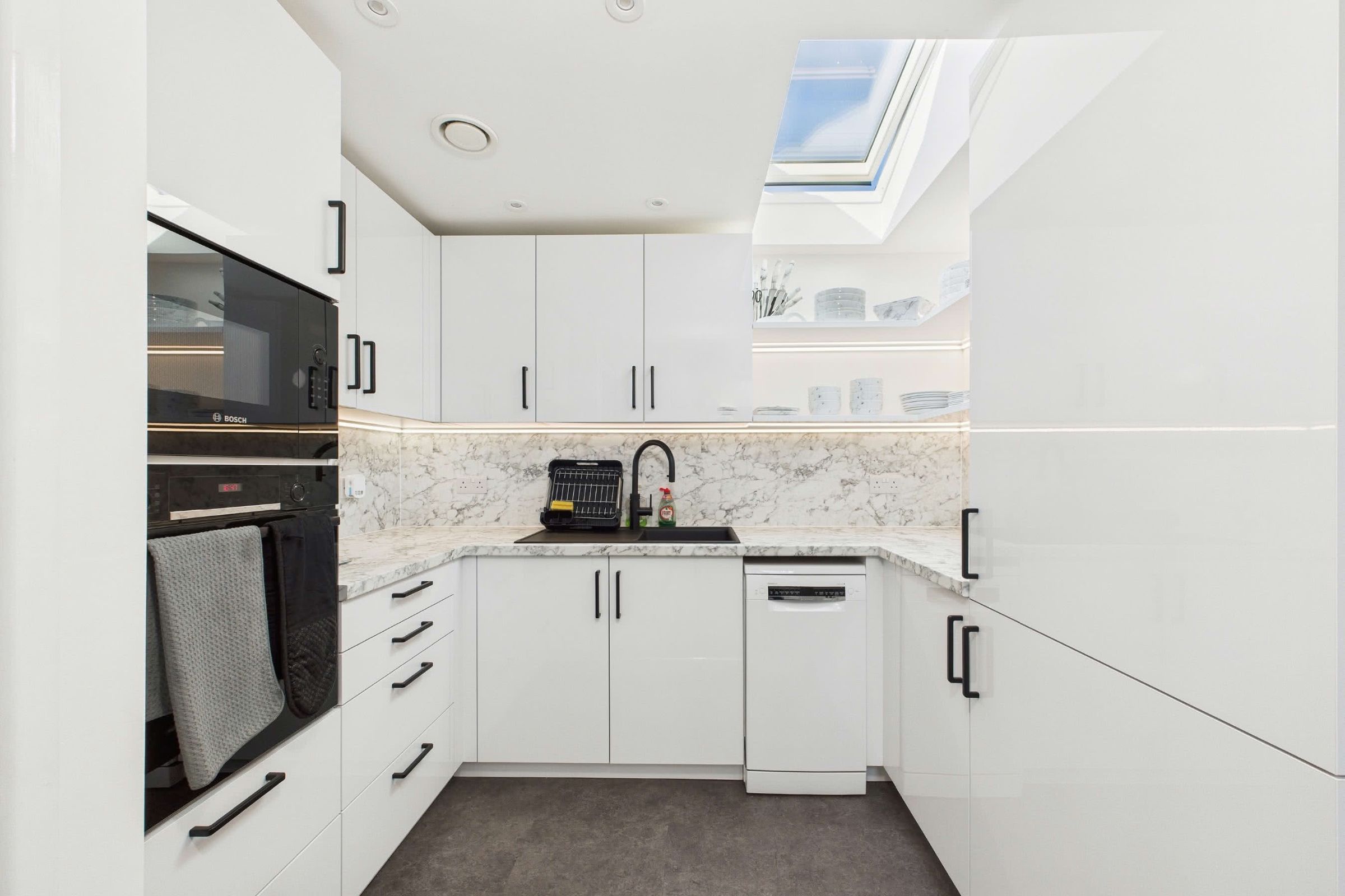 Recently fitted by First Interiors, the kitchen presents a sleek and contemporary design. It incorporates a modern range of white gloss wall and base units complemented by shelving and a stylish marble-effect countertop. This is finished with matching aquaboard splashback and enhanced by under-counter lighting. The kitchen is equipped with extensive storage solutions, including pull-out shelves and baskets to ensure ease of access. A composite sink and drainer is paired with a flexible hose tap offering instant boiling, filtered and sparkling water on demand. Cooking facilities include an eye-level double oven, comprising both a conventional and microwave oven, plus an integrated Siemens fridge/freezer and a dishwasher included in the sale. Natural light is drawn in through an electronically operated, solar-powered triple-glazed Velux window, equipped with rain detection technology to close automatically. The space is completed with a luxury vinyl tile floor.