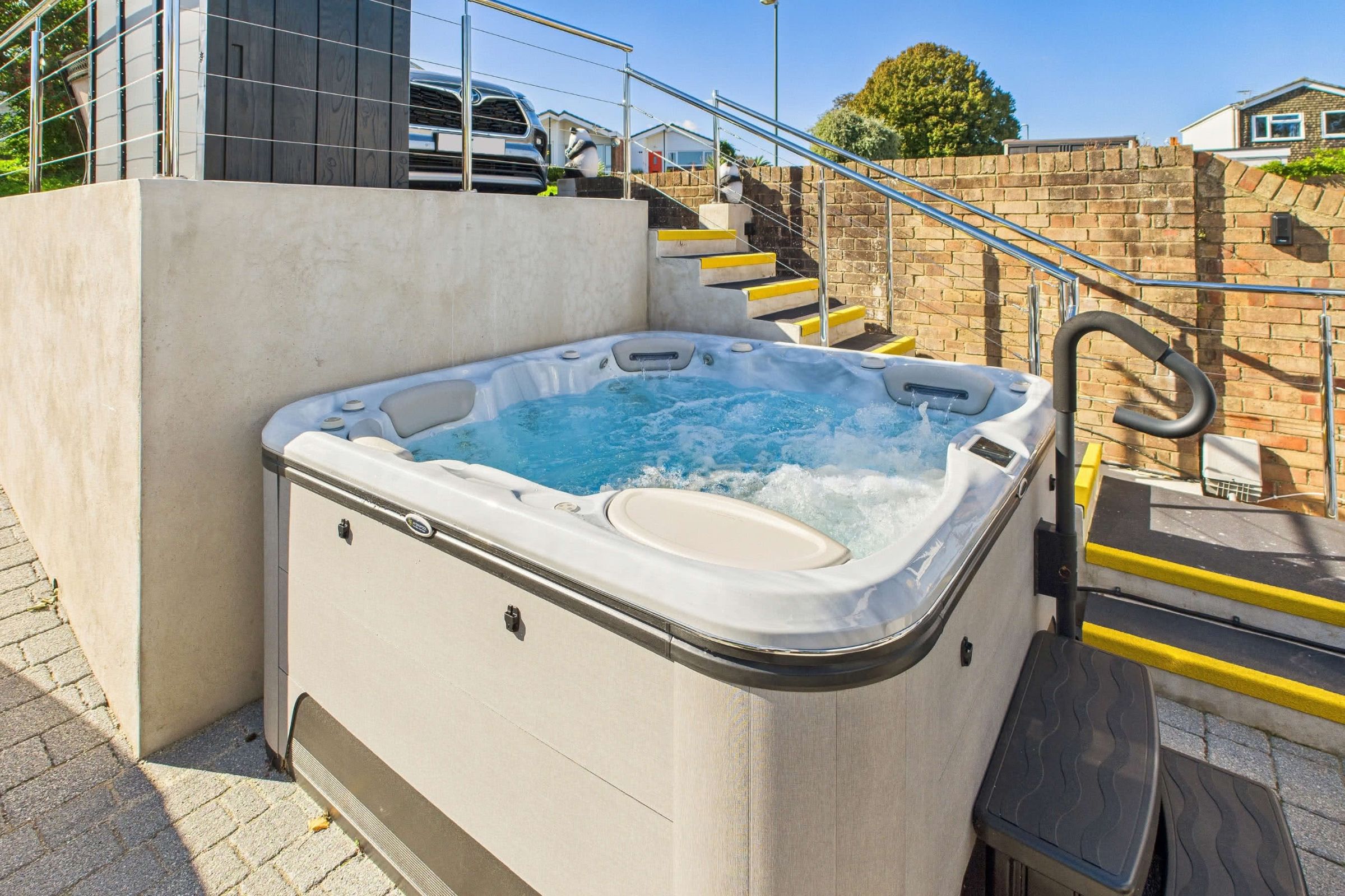 The frontage of the property has been thoughtfully landscaped and finished throughout with the same high-quality commercial-grade non-slip concrete pavers, ensuring both durability and ease of maintenance. From the driveway and pathway, access is given to an attractive front patio area, ideal for relaxing and entertaining. A premium Hydropool five-person hot tub, complete with self-cleaning system and UV filtration, is positioned here and is included in the sale. Practical and secure features further enhance this space, including security lighting throughout both the driveway and pathway, and a composite fence and gate enclosing the front patio. A durable composite shed offers additional storage and is likewise included. Finally, access to the property itself is provided via a uPVC triple-glazed entrance door.