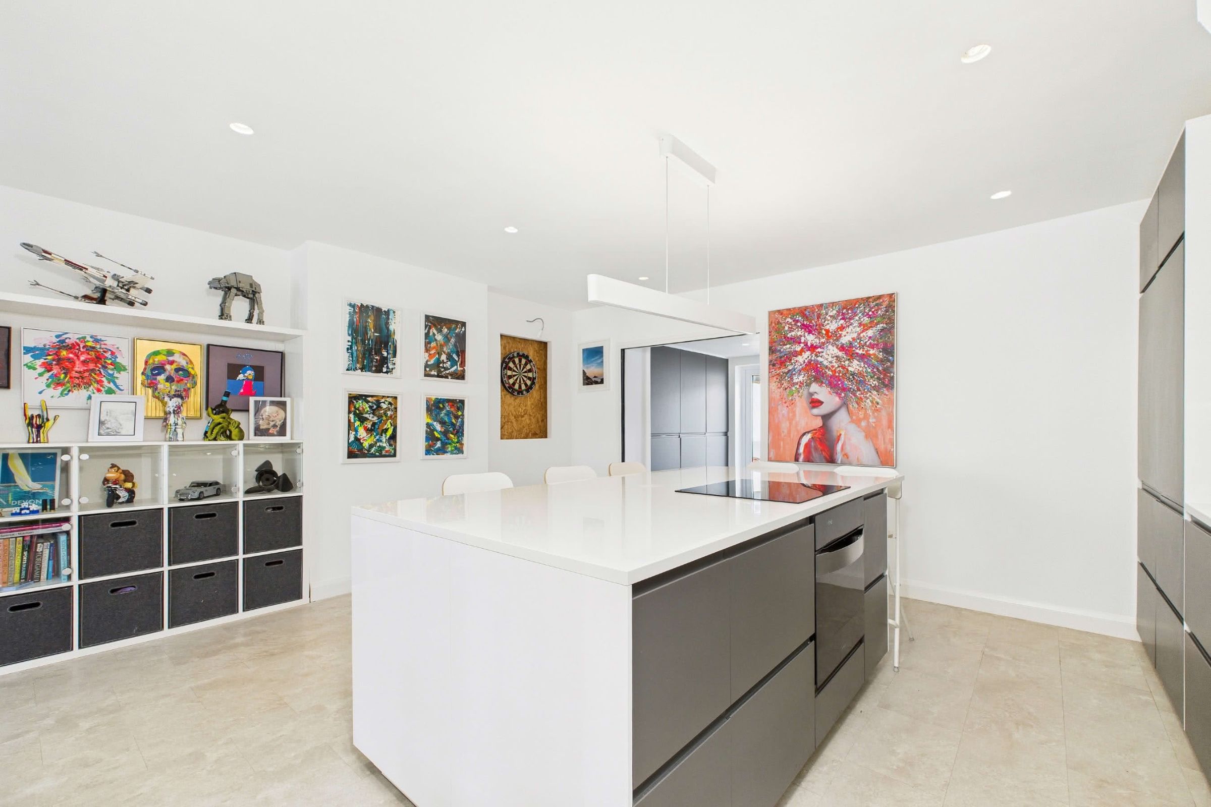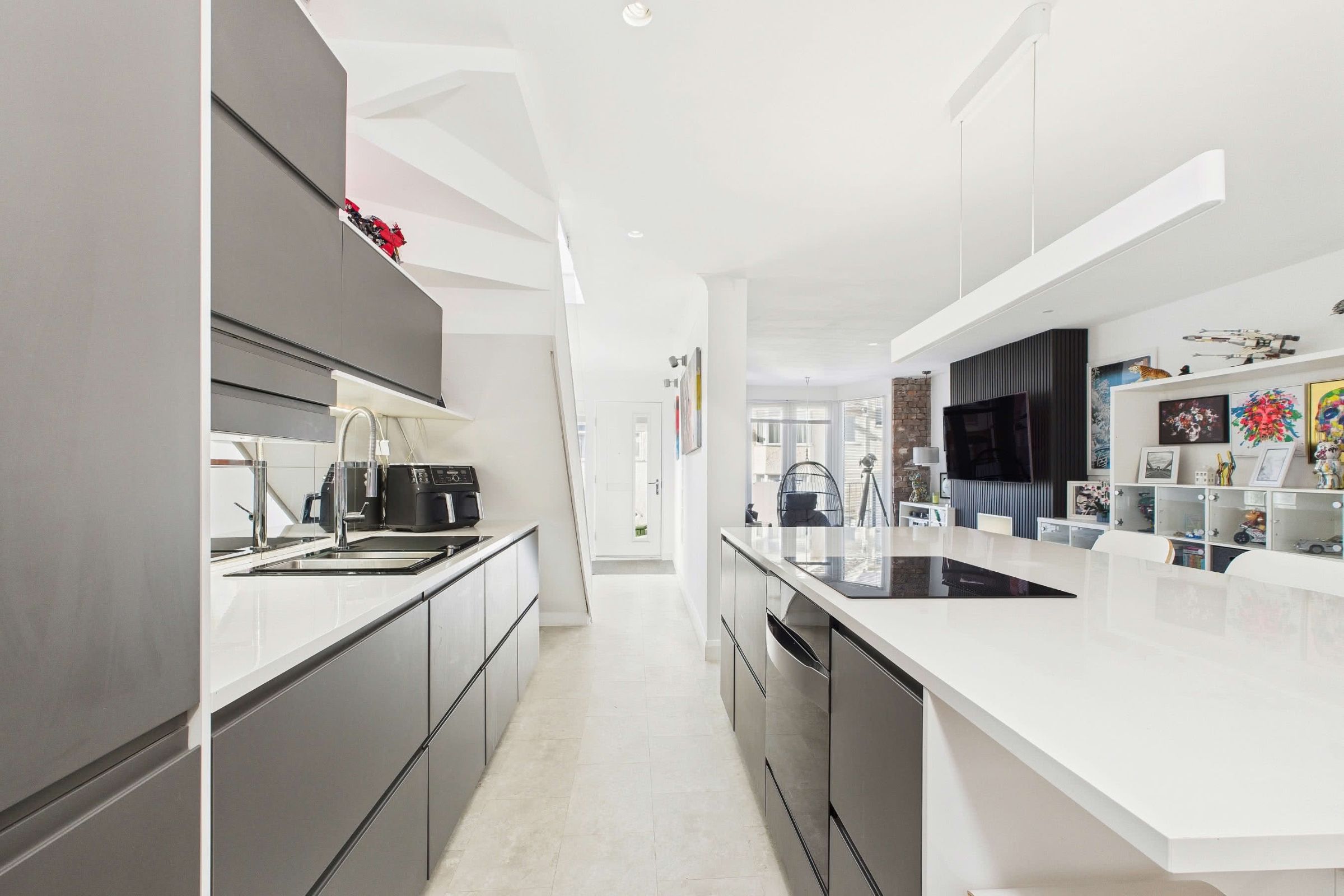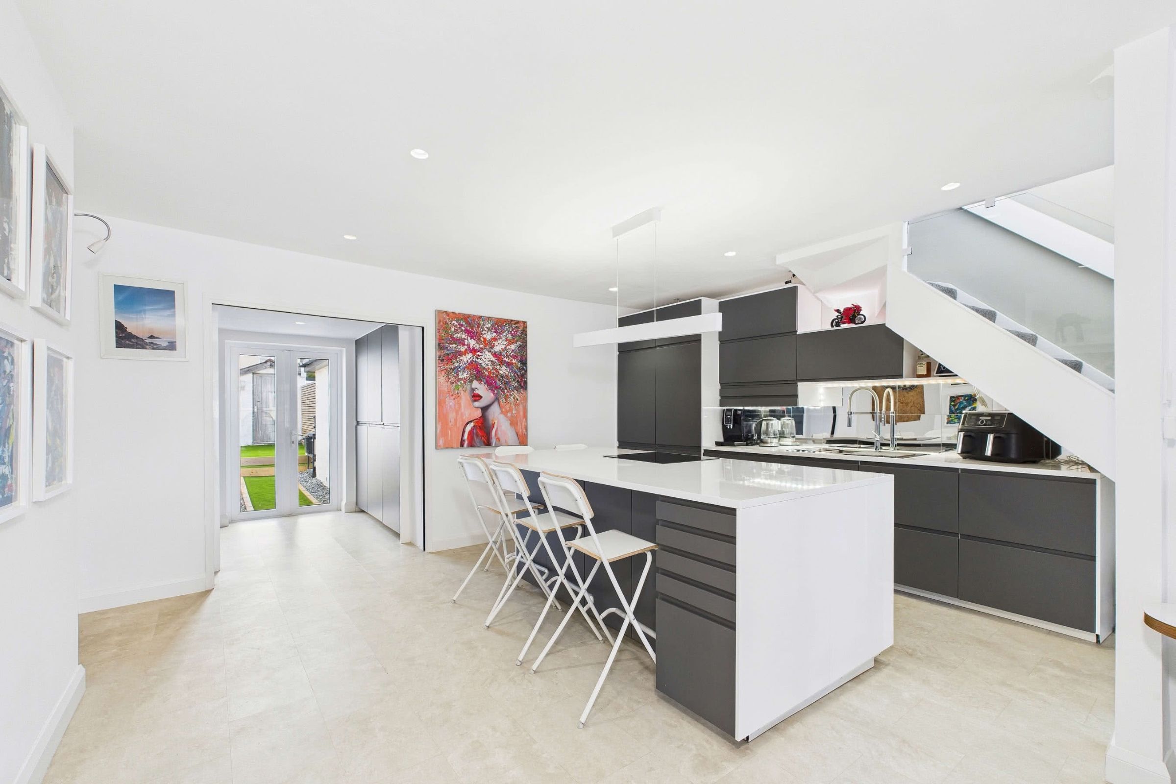 The kitchen continues with Karndean LVT flooring and presents an array of matte charcoal grey wall and base units. These units are topped with contrasting white worktops and complemented by striking mirrored splashbacks. Generous provisions for storage include innovative drawer-in-drawer solutions, ensuring a highly functional layout. At the heart of the space, a central island serves as a culinary hub, incorporating further cupboards and drawers beneath, while the extended worktop creates dual breakfast bar seating areas. Overhead, mood lighting accentuates its presence. Integrated within the island is a premium digitally operated oven alongside a flush induction hob with four zones, including a versatile 'bridge' function combining two zones into one. Further integrated appliances feature a near-full-height fridge and a built-in dishwasher, while a deep-set one-and-a-half stainless steel sink, with glass surround and flush drainer, completes this thoughtfully designed kitchen.Practical Utility Room