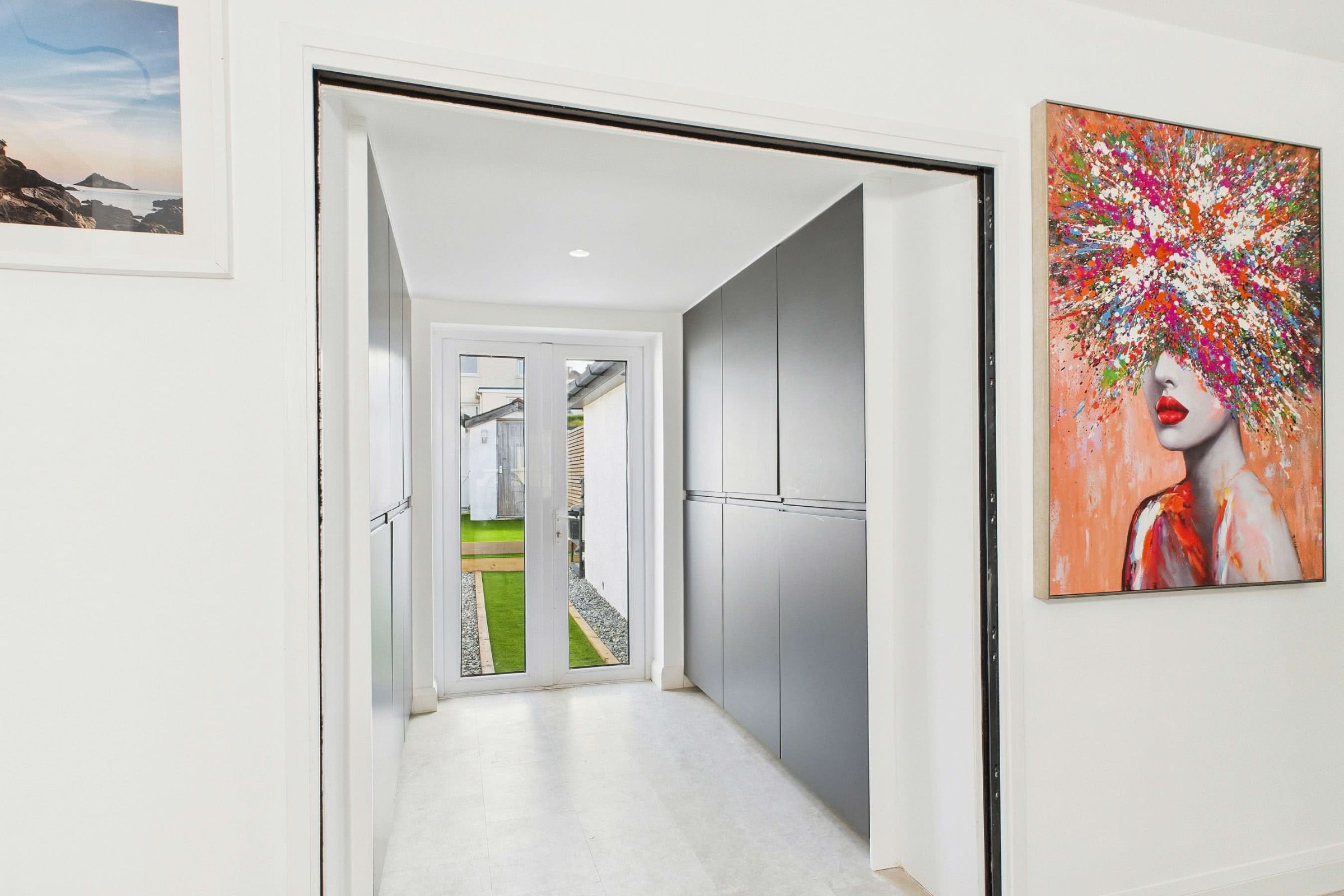 Adjoining the kitchen, an open doorway leads into a well-planned utility space where the Karndean LVT flooring continues for a seamless finish. The utility is fitted with full-height cabinetry that echoes the kitchen's contemporary design, providing generous storage solutions. Integrated appliances include a built-in freezer, washing machine, and tumble dryer, while the gas-fired Promax combi boiler is neatly concealed within the cabinetry for a streamlined appearance. Double-glazed doors open directly to the garden, ensuring both functionality and convenience.Light-Filled Living Space
