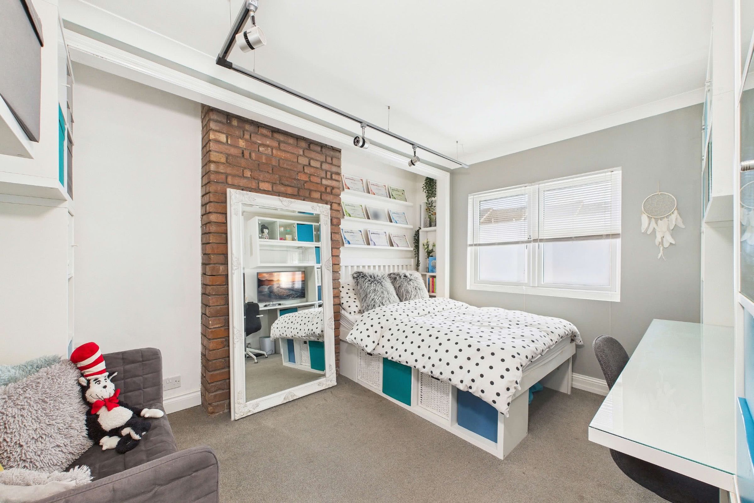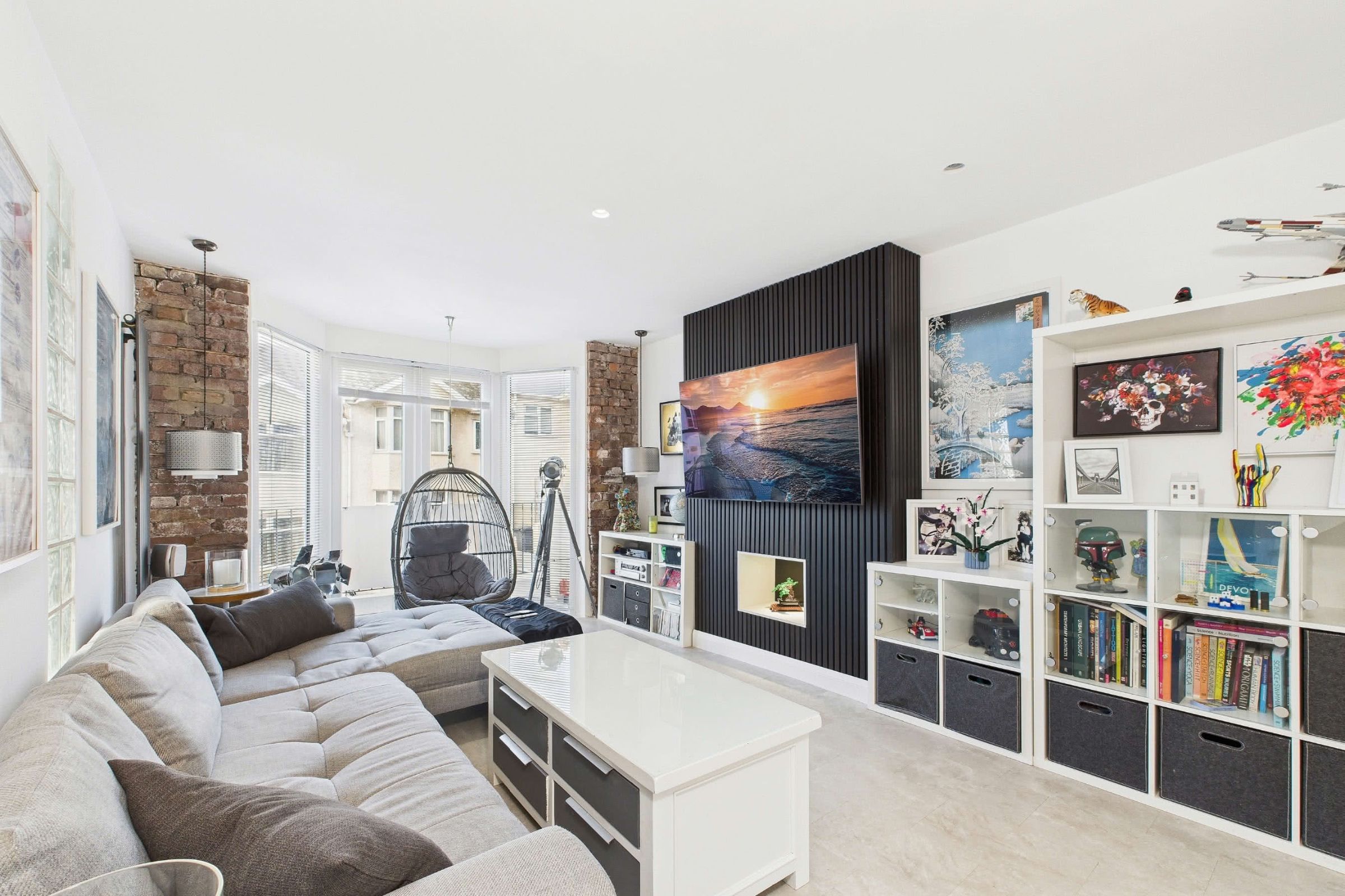 Ascending to the first floor, the landing is naturally lit by an opaque side window and provides access to the loft via a hatch with a pull-down ladder. The loft itself is fully boarded and walled, currently utilised as a practical home office. From the landing, contemporary internal doors open to three bedrooms and the family bathroom. The principal bedroom, a spacious double at the front of the property, retains the original exposed timber flooring. It is enhanced by a walk-in double-glazed bay window that fills the room with light while a tall, vertical powder-coated radiator adds a modern touch. The second bedroom, also a generous double, overlooks the rear and benefits from an opaque window and an exposed brick feature wall for added character. The third bedroom, currently serving as a dressing room, is a well-proportioned single with a front-facing double-glazed window.Characterful Modern Bathroom