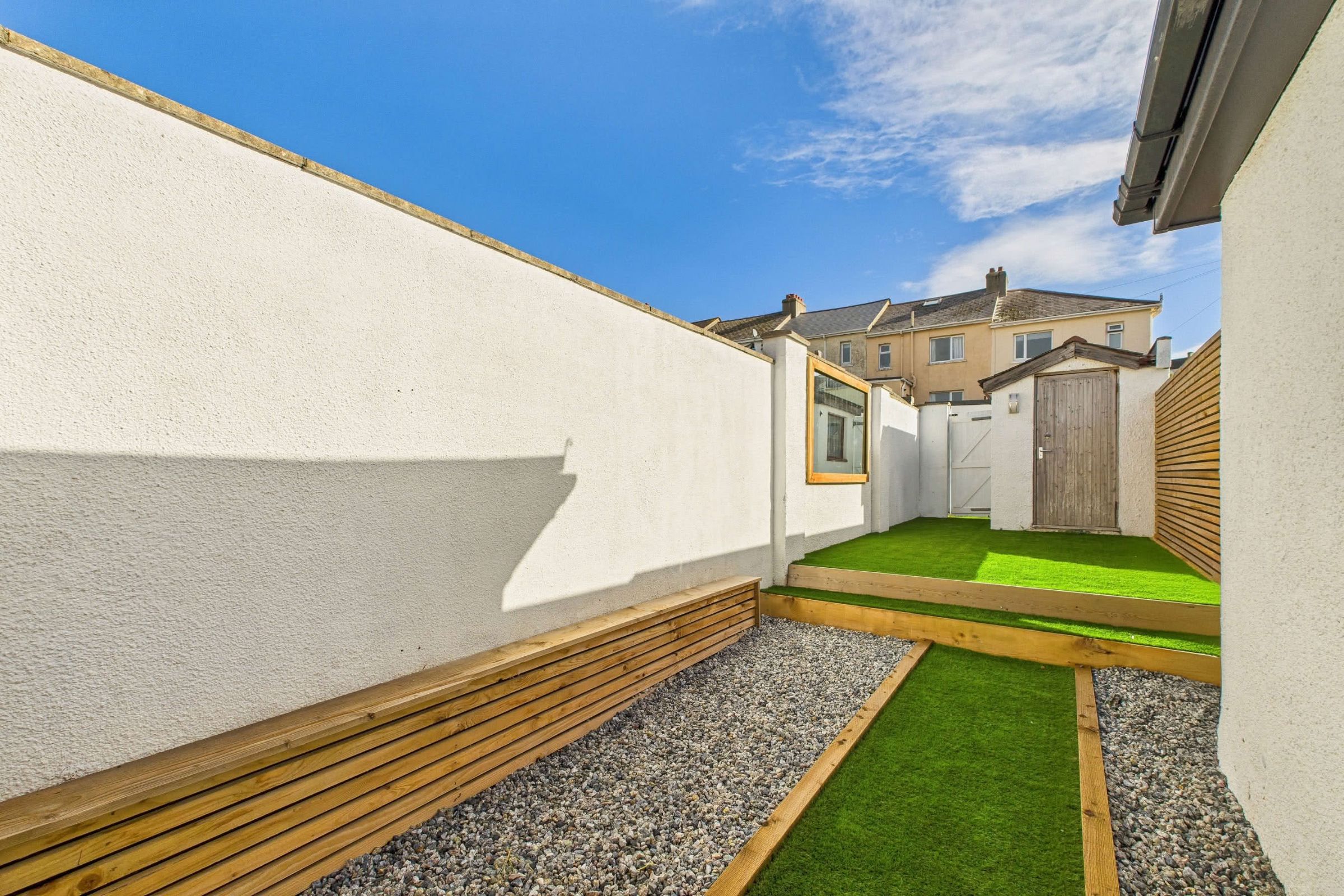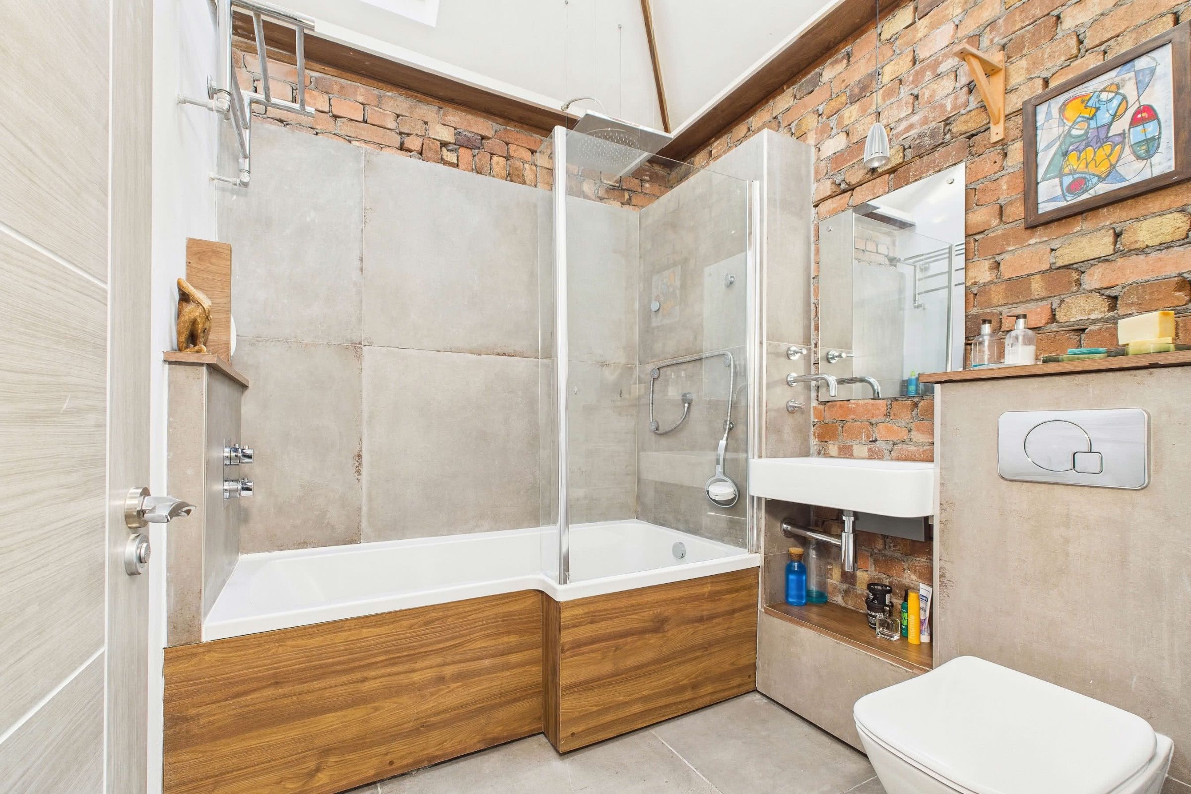 The first floor is served by a stylish and distinctive bathroom, illuminated by twin Velux windows that provide excellent natural light. Industrial-inspired design is blended with modern convenience, featuring exposed brickwork alongside large-format concrete-effect tiling, all enhanced by underfloor heating. A contemporary white suite includes a bath with overhead rainfall power shower, additional body jets, and a handheld attachment, enclosed by a glazed screen. Complementing this is a wall-mounted wash basin with sleek taps, practical niche storage beneath, and a concealed-cistern WC. The natural wood-effect finish to the bath panel and shelving introduces warmth, perfectly balancing the industrial character of the space.Private Low-Maintenance Garden Retreat