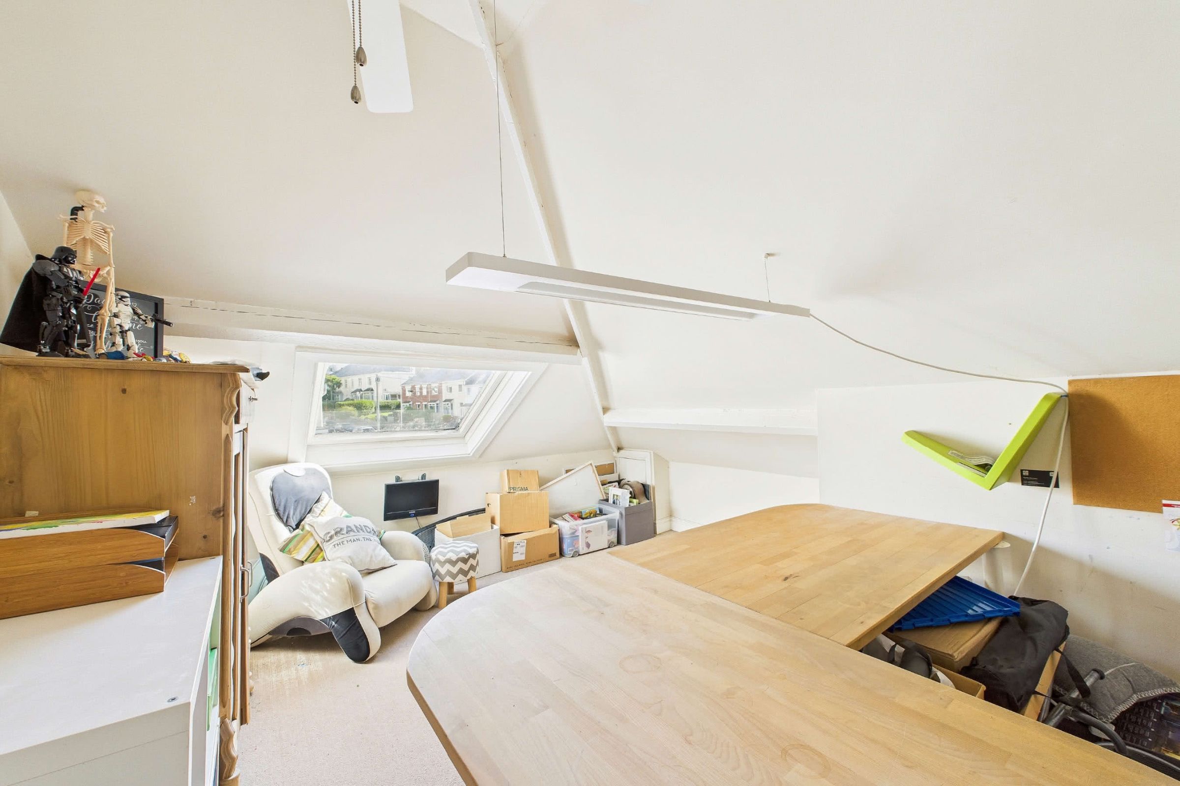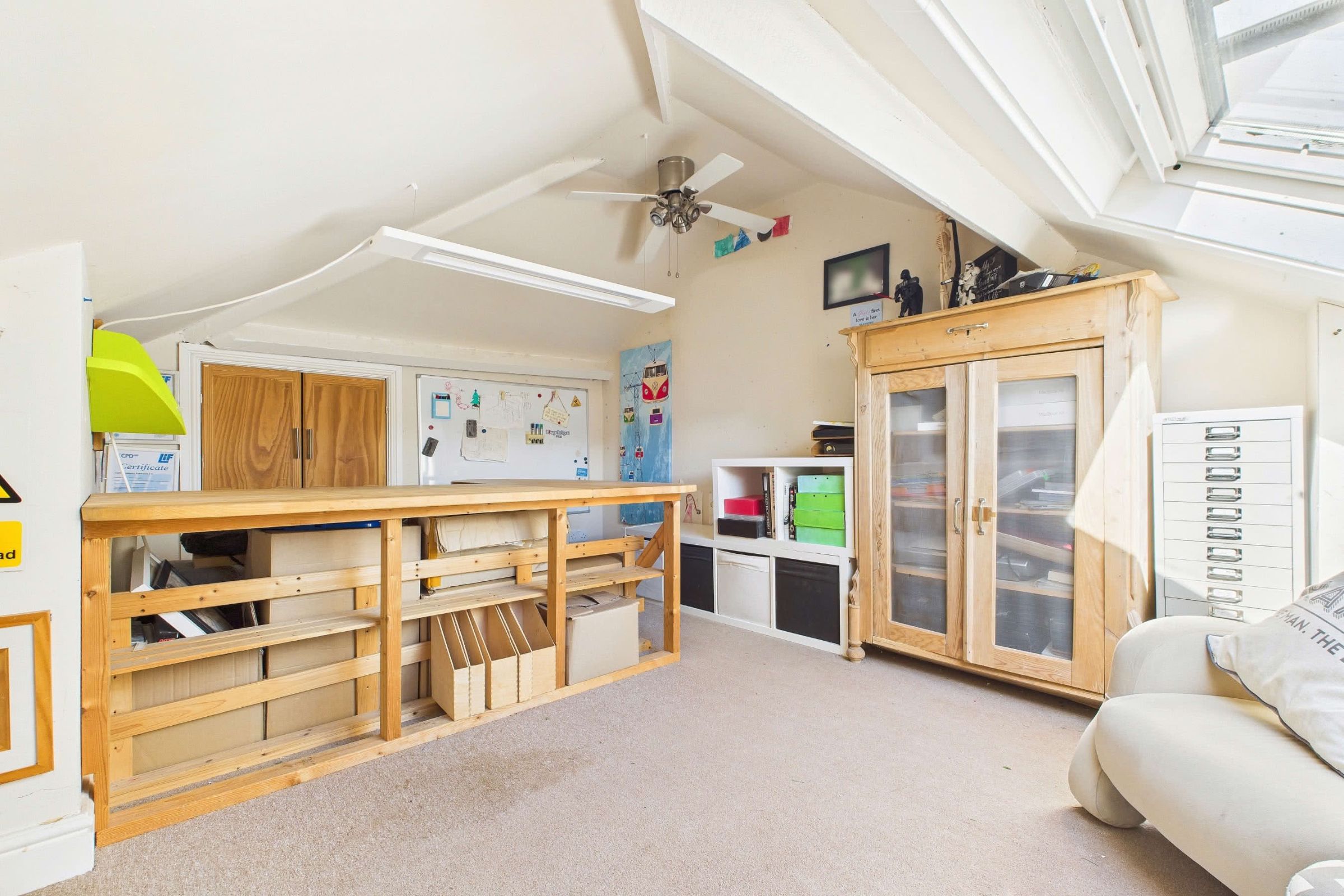 Upstairs, three well-proportioned bedrooms include two generous doubles. The bathroom is tastefully styled, combining rustic character with modern comforts such as underfloor heating. A cleverly converted loft adds valuable flexibility, providing a bright and practical home office with excellent storage tucked into the eaves.