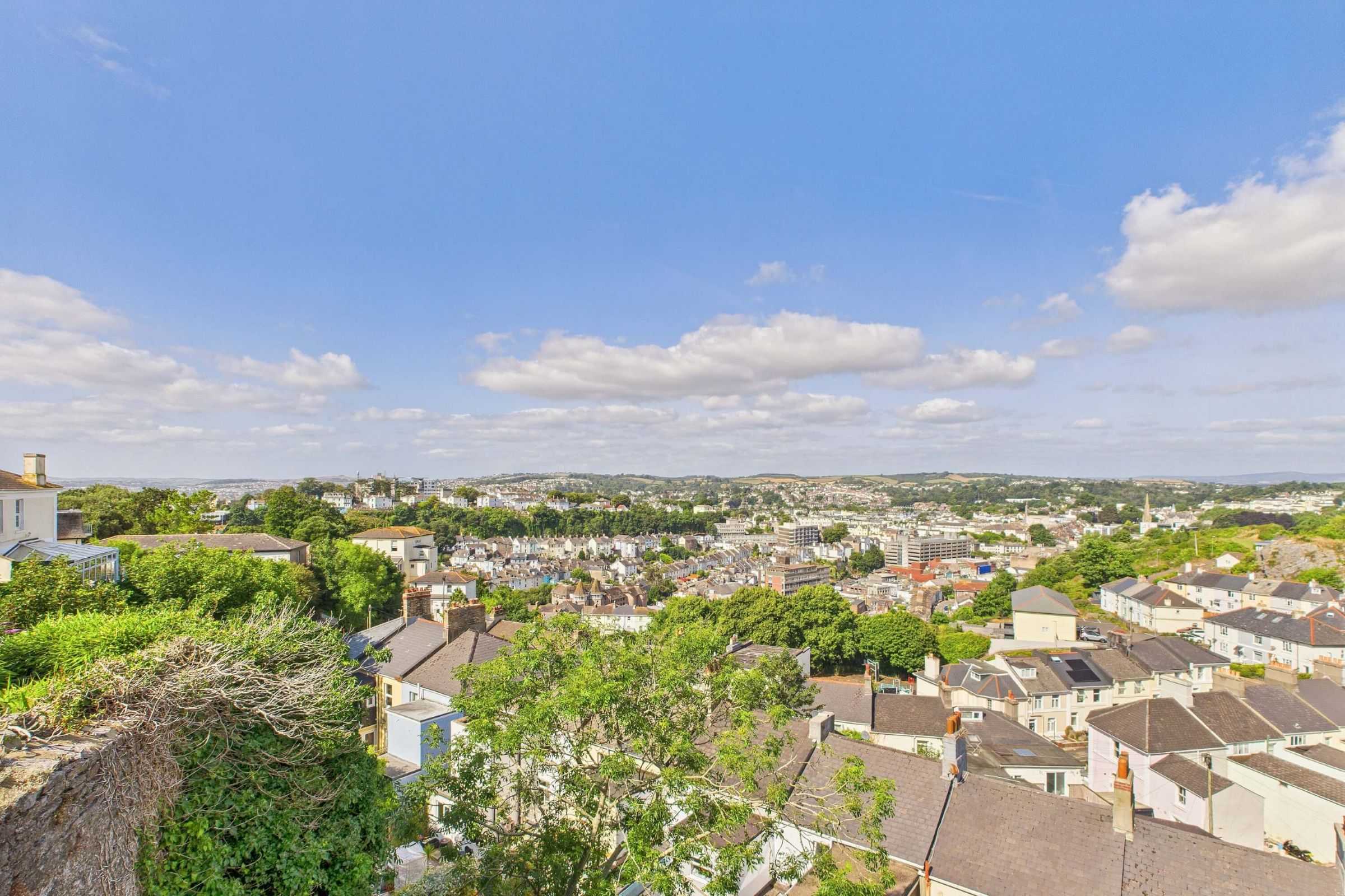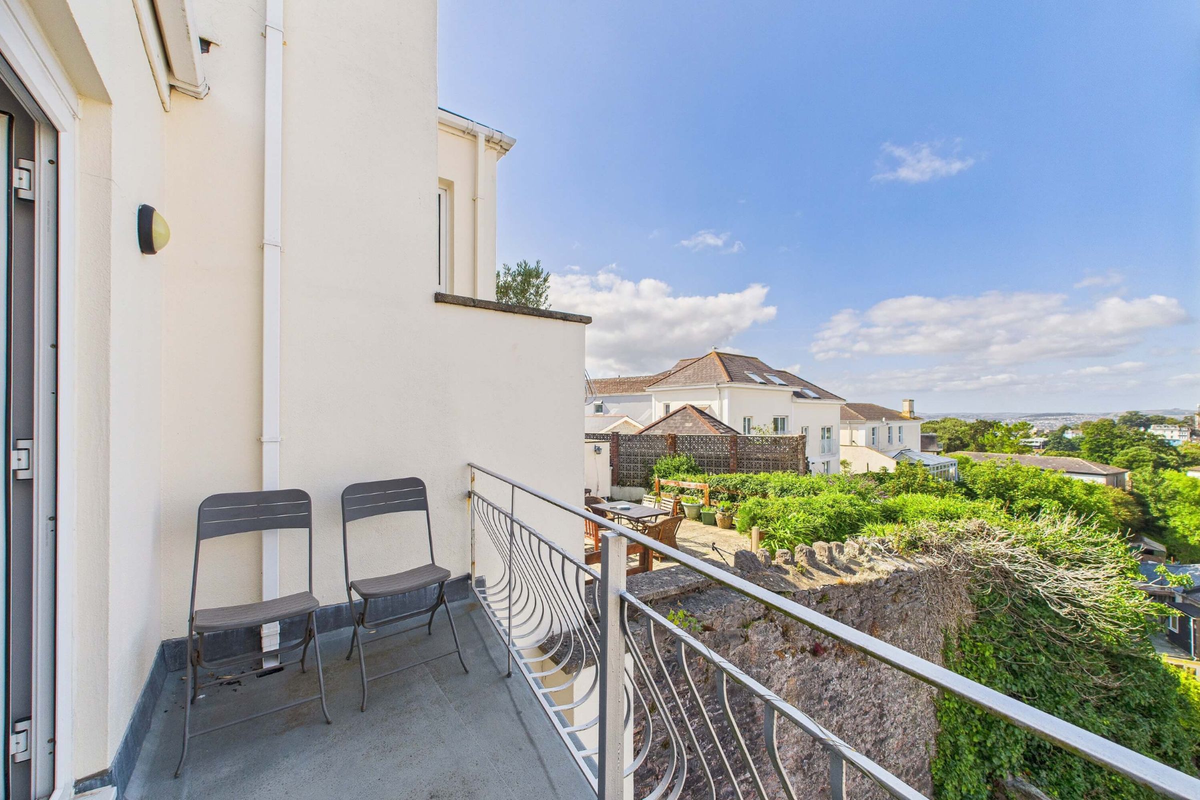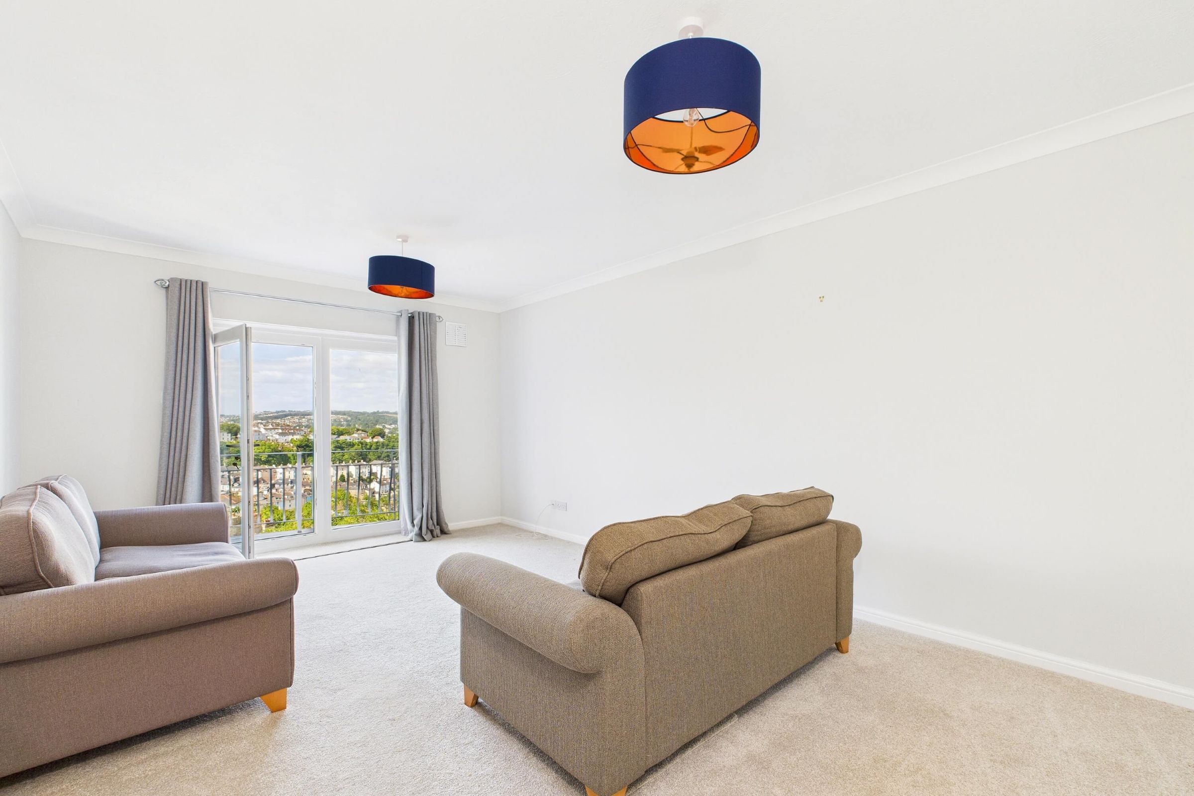 The apartment features a generously proportioned living room, offering a comfortable and versatile space for relaxation or entertaining. A double-glazed patio door provides direct access to the private balcony, which enjoys far-reaching panoramic views over the town and towards the scenic hills of Marldon, with Dartmoor's rolling landscape visible in the distance. The balcony provides ample space for outdoor seating or small furniture and is enclosed with attractive wrought iron railings. The living room has a TV aerial point, multiple power sockets, and a central heating radiator.