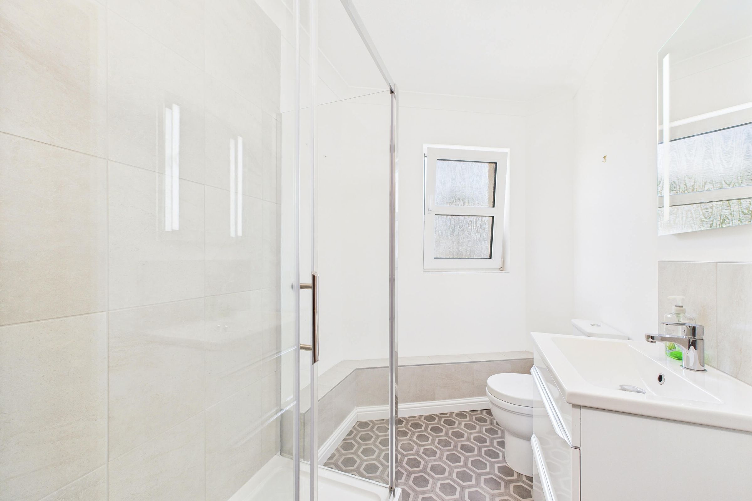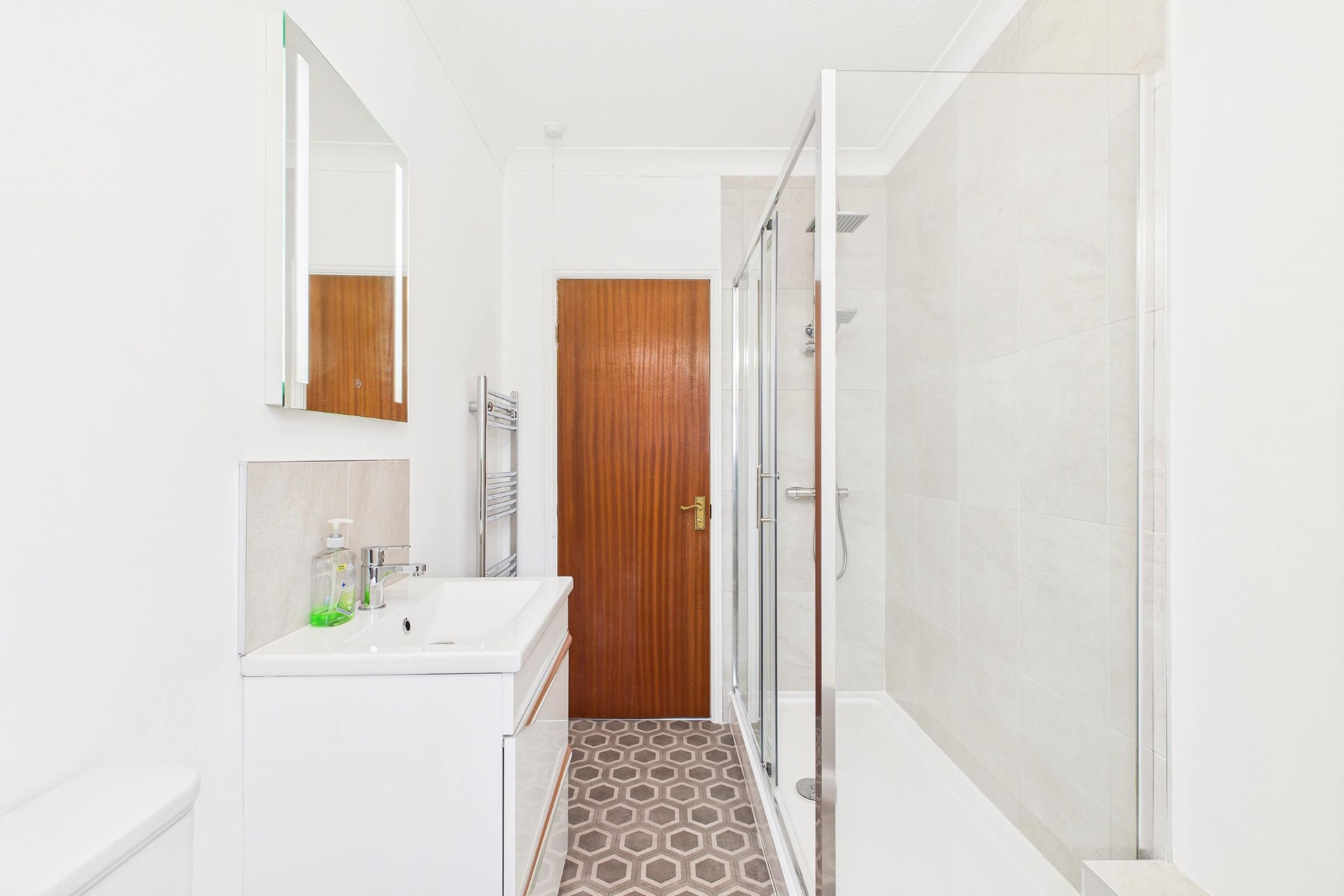 The property benefits from a contemporary shower room, stylishly appointed with a modern three-piece suite. It comprises a generously sized double shower enclosure with tiled walls, featuring both an overhead rain shower and a handheld attachment for added convenience. A sleek vanity unit with integrated drawers supports a wash basin, complemented by a wall-mounted, illuminated mirrored cabinet above. The suite is completed with a low-level WC. Additional features include an obscured double-glazed window providing natural light and privacy, as well as a wall-mounted heated towel rail for added comfort.