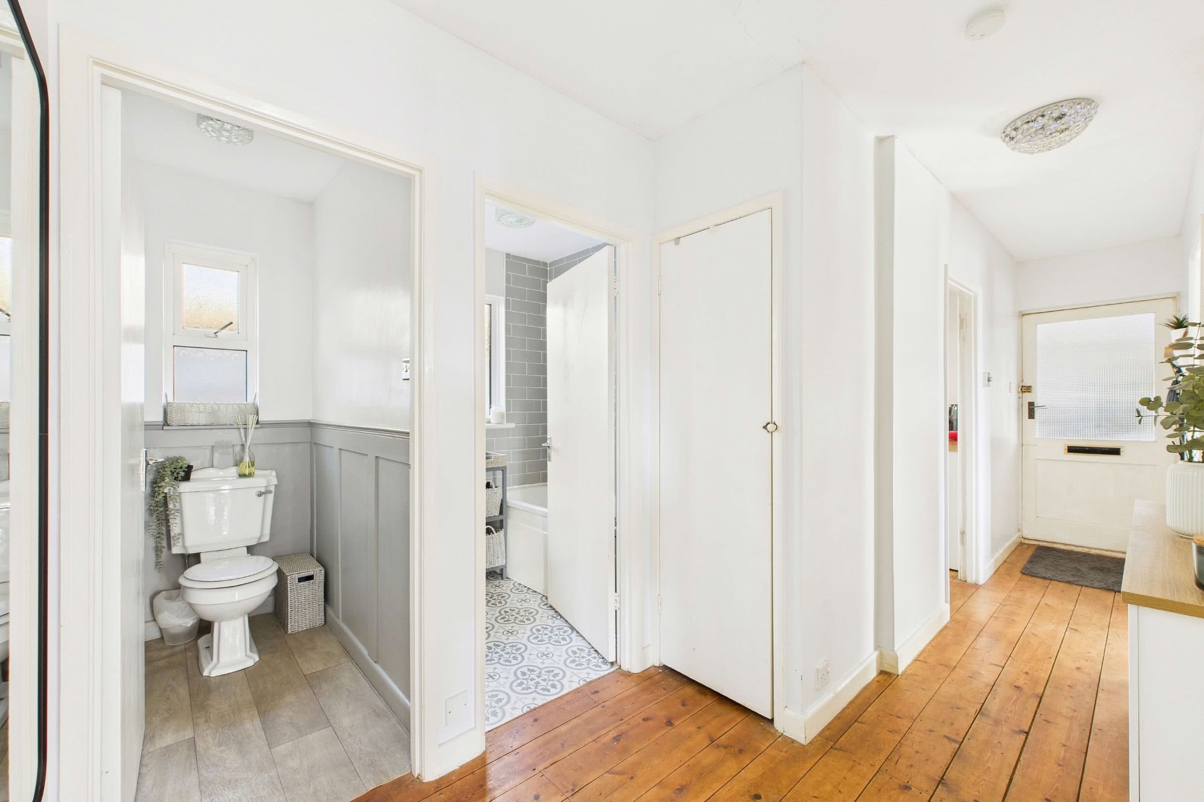 The property is approached via a driveway providing off-road parking for two vehicles. From here, steps rise past the useful under-house utility room to the main entrance. On entering, you are welcomed into a generously proportioned porch, offering ample space and benefiting from a rear door giving direct access to the garden. Fitted with worktop and base units along one wall, together with an integrated fridge and freezer, this area provides excellent additional storage and preparation space. An internal door opens into a bright and spacious hallway with attractive original wood flooring, giving access to all principal rooms. The hallway also incorporates a built-in storage cupboard and a loft hatch.