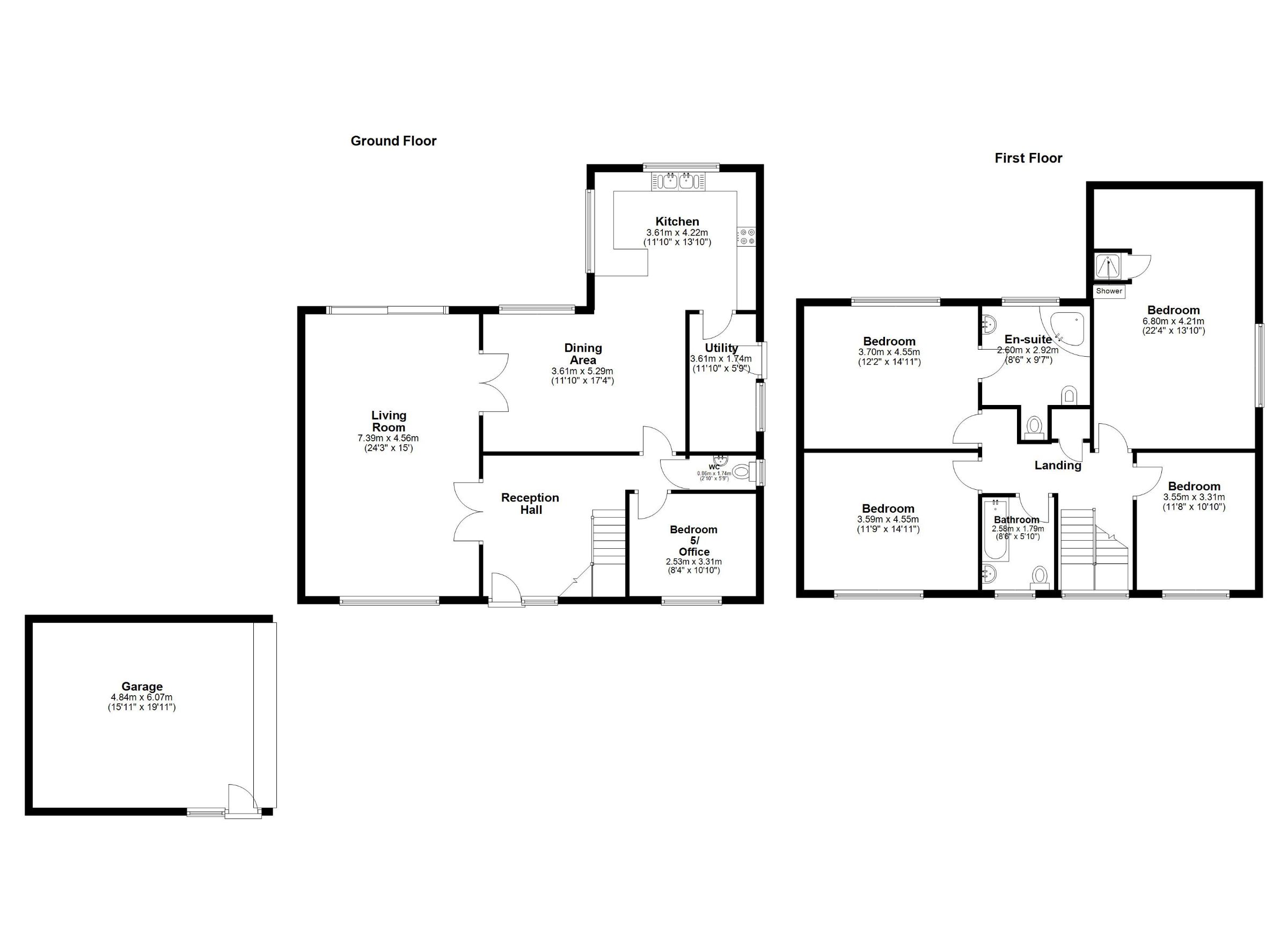 Upstairs, the accommodation comprises four generously sized bedrooms, including a principal suite with an expansive en-suite bathroom, along with a large family bathroom. While the interiors would benefit from modernisation, the property offers a well-balanced and highly flexible layout that can be tailored to suit a range of lifestyle needs.