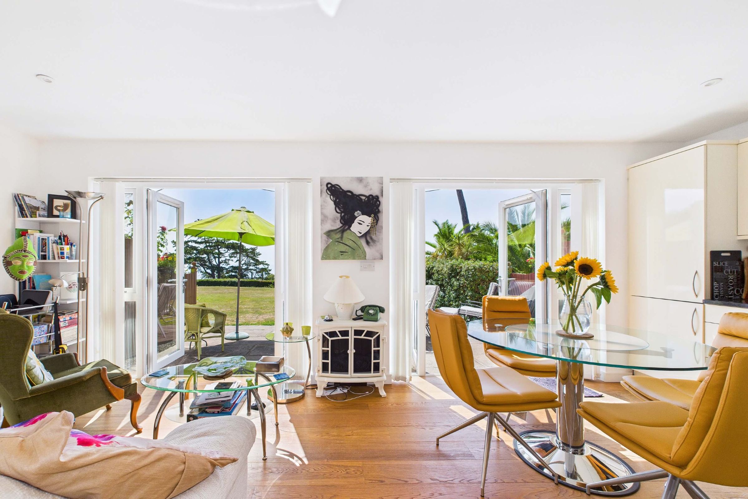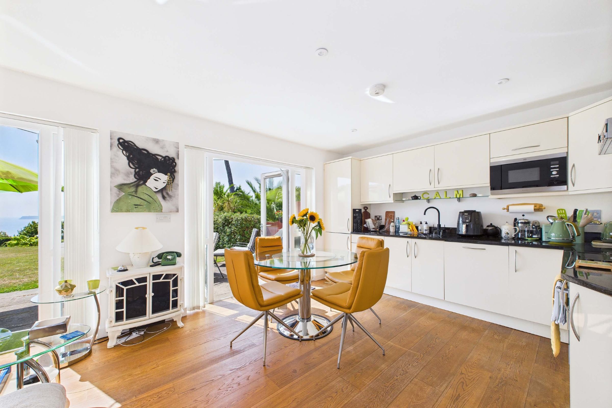 From the main hallway, five steps descend into the open plan sitting room, kitchen and dining area, beautifully finished with engineered oak flooring. This light-filled space is enhanced by double-glazed French doors, framing far-reaching views over the communal lawns and out to the sea, creating a truly captivating backdrop. The kitchen is fitted with a comprehensive range of cream wall and base units, complemented by granite work surfaces incorporating an inset stainless steel sink. Quality integrated appliances include an oven with hob and extractor over, an eye-level microwave, a Neff dishwasher and a fridge/freezer. French doors open directly onto the private paved patio, offering open views across the landscaped communal gardens to the sparkling waters beyond. The patio, enclosed to either side by fencing, provides an ideal setting for outdoor relaxation while enjoying the superbly maintained grounds and stunning coastal outlook.