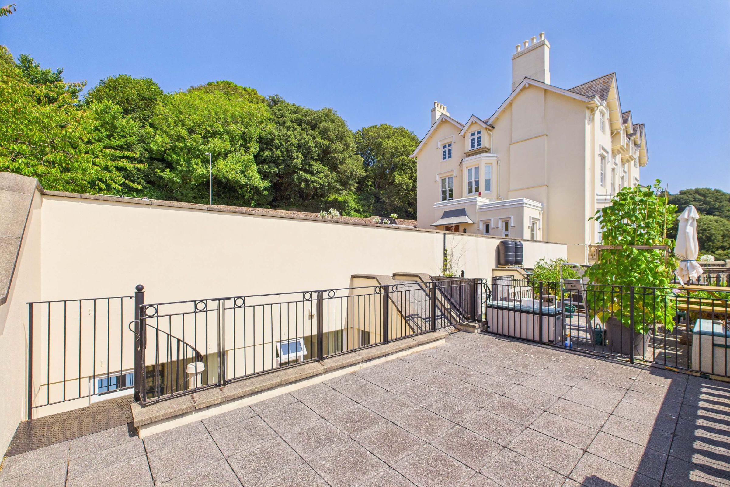 From the open plan living area, a double-glazed door opens to a private courtyard, an ideal spot for outdoor storage or, subject to the necessary permissions, potential conversion into additional living space. The courtyard is finished with tiled flooring and benefits from two outdoor electrical sockets. A spiral staircase rises from the courtyard to the impressive roof terrace, a superb feature of the property. This expansive outdoor space enjoys panoramic views over the landscaped communal gardens and out to Torbay's shimmering waters. Bordered by elegant stone balustrades, it offers a magnificent setting for relaxing, entertaining, and appreciating the captivating coastal scenery.