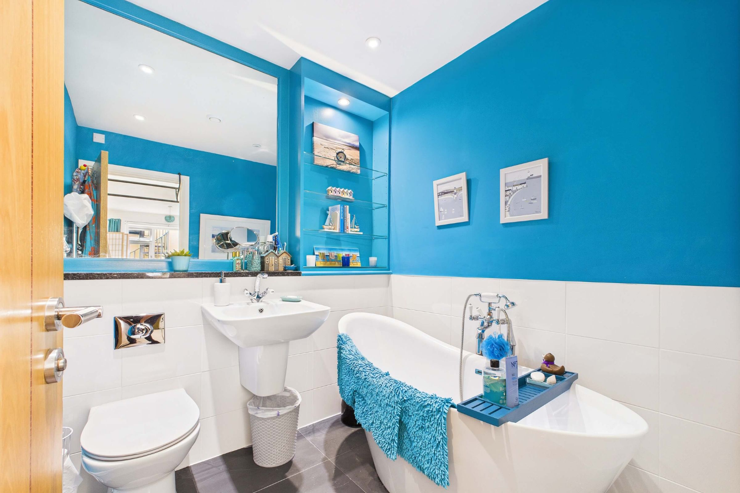The apartment offers two well-proportioned double bedrooms, each enjoying views towards the private inner courtyard through double-glazed windows and equipped with wall-mounted thermostat controls for underfloor heating. The principal bedroom benefits from a stylish en-suite bathroom, finished in a vibrant coastal-inspired colour scheme, with teal walls set against crisp white half-height tiling. The contemporary white suite comprises of a wall-mounted wash basin with a large fitted mirror above, a concealed cistern WC, and a freestanding bath with chrome mixer tap and hand-held shower attachment. Additional features include a recessed glass-shelved display niche with spotlighting, ideal for decorative items or toiletries. The en-suite is finished with dark large-format floor tiles, and a wall-mounted heated towel rail.