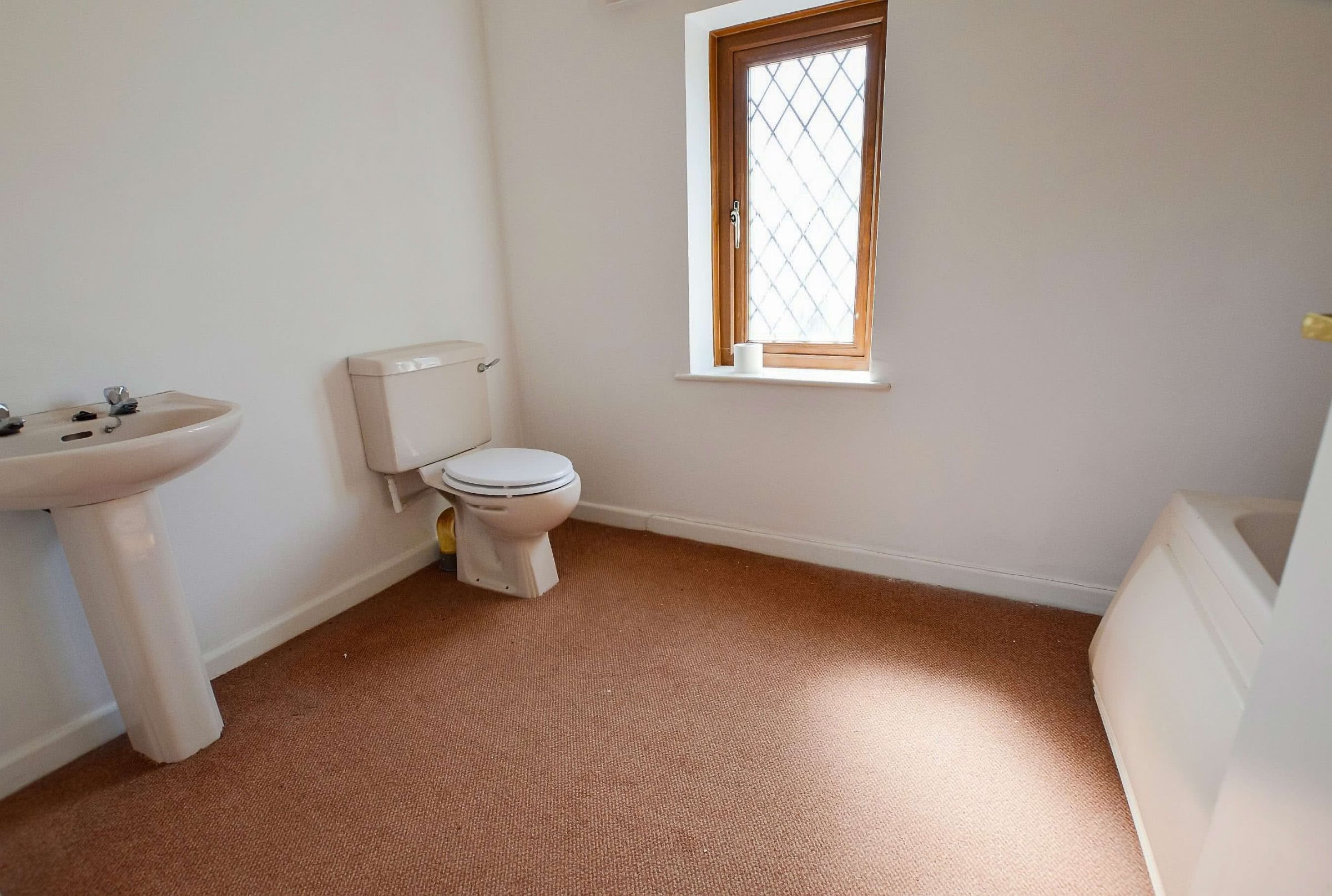 Panelled bath with tiled surround, pedestal wash basin, and low-level W.C. Radiator, extractor fan, and uPVC double-glazed leaded light window to the front.