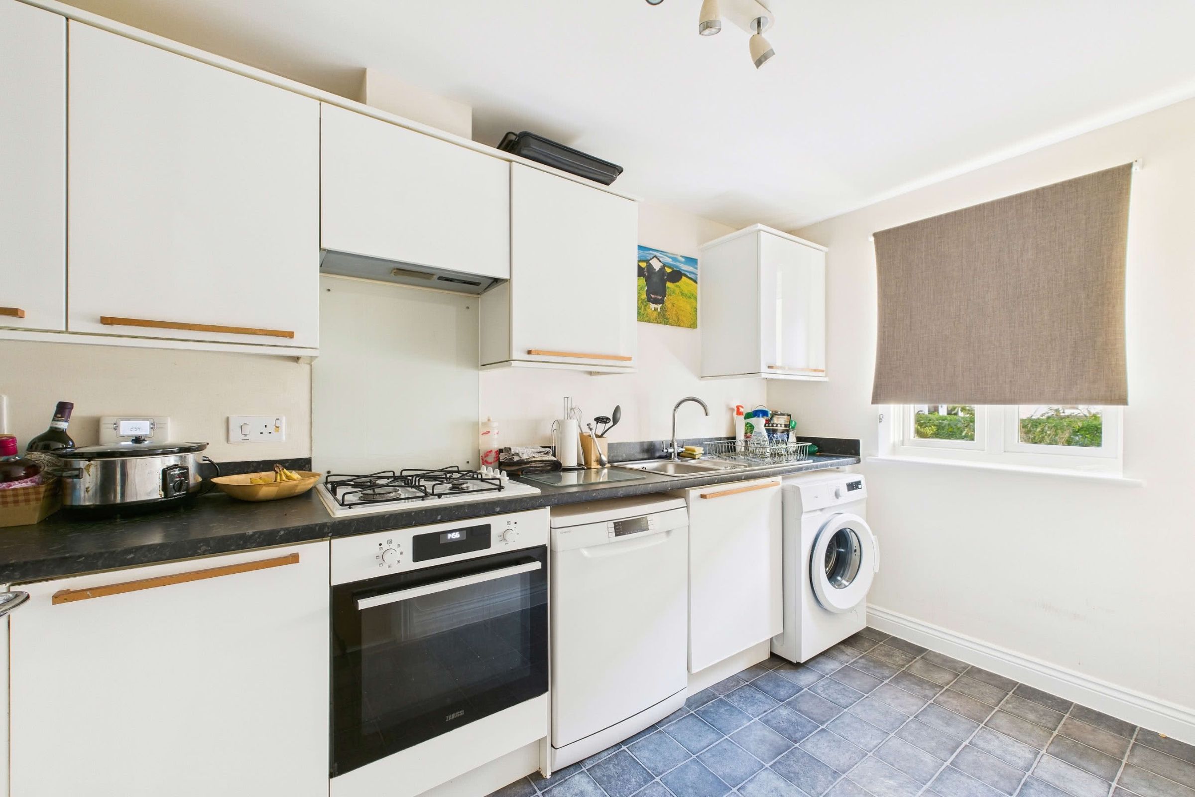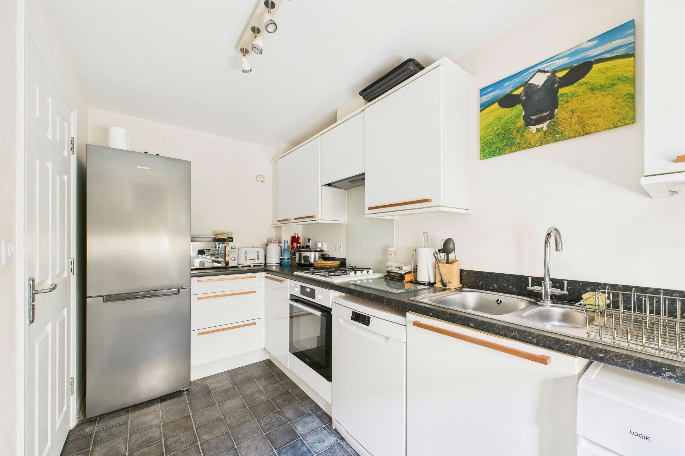 The property benefits from a modern kitchen, fitted with a range of gloss white wall and base units with contrasting wood handles. These units are complemented by roll-edge worktops and a matching upstand. There is a one-and-a-half bowl stainless steel sink and drainer, while beneath the counter there is space and plumbing for both a washing machine and a dishwasher. The kitchen is equipped with an integrated electric oven and a gas hob set into the worktop, positioned beneath an extractor hood. Additional space is provided for a freestanding fridge/freezer, and the gas boiler is neatly concealed within matching cabinetry. Completing the room is a wall-mounted central heating radiator and a double-glazed window to the front aspect, allowing ample natural light.
