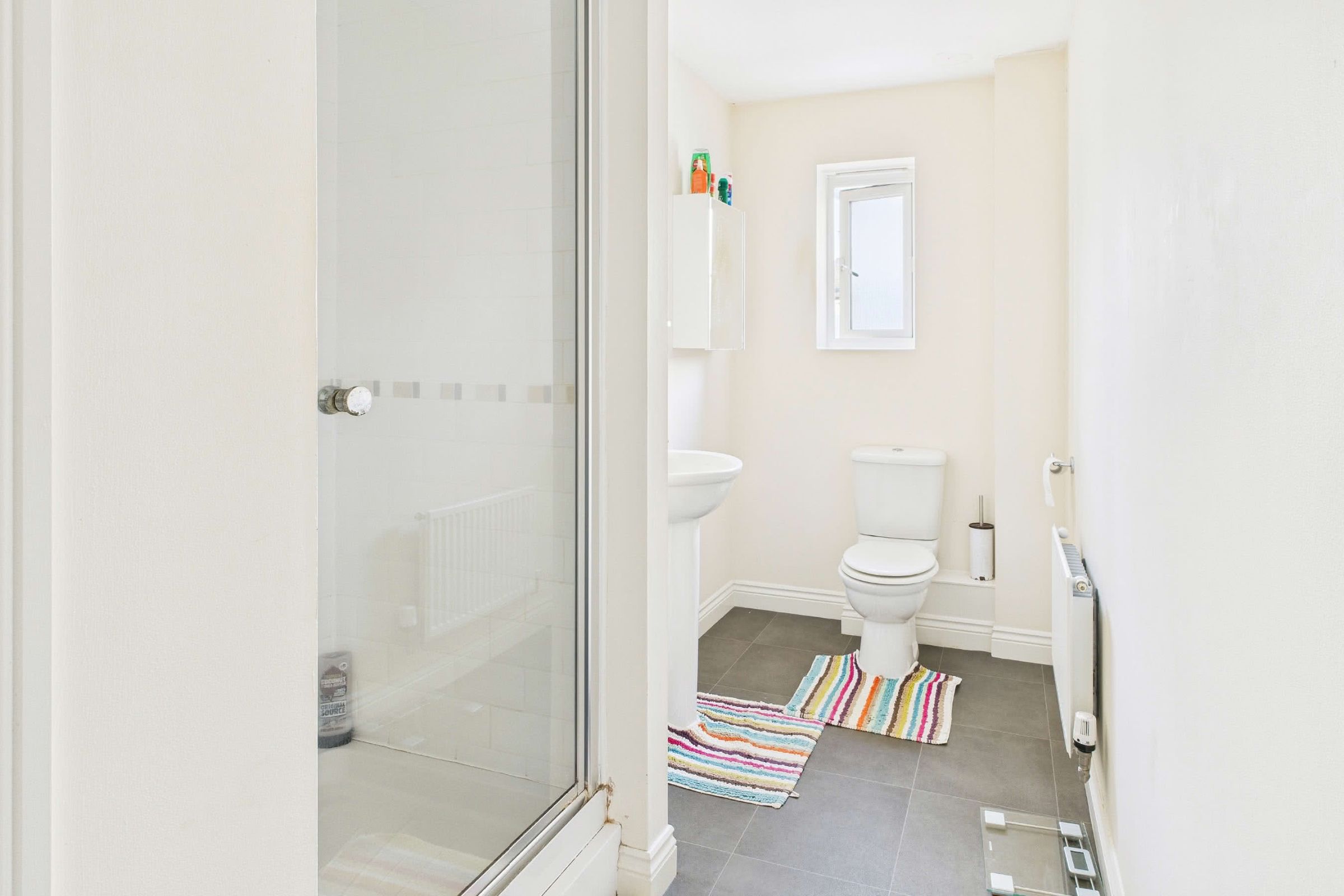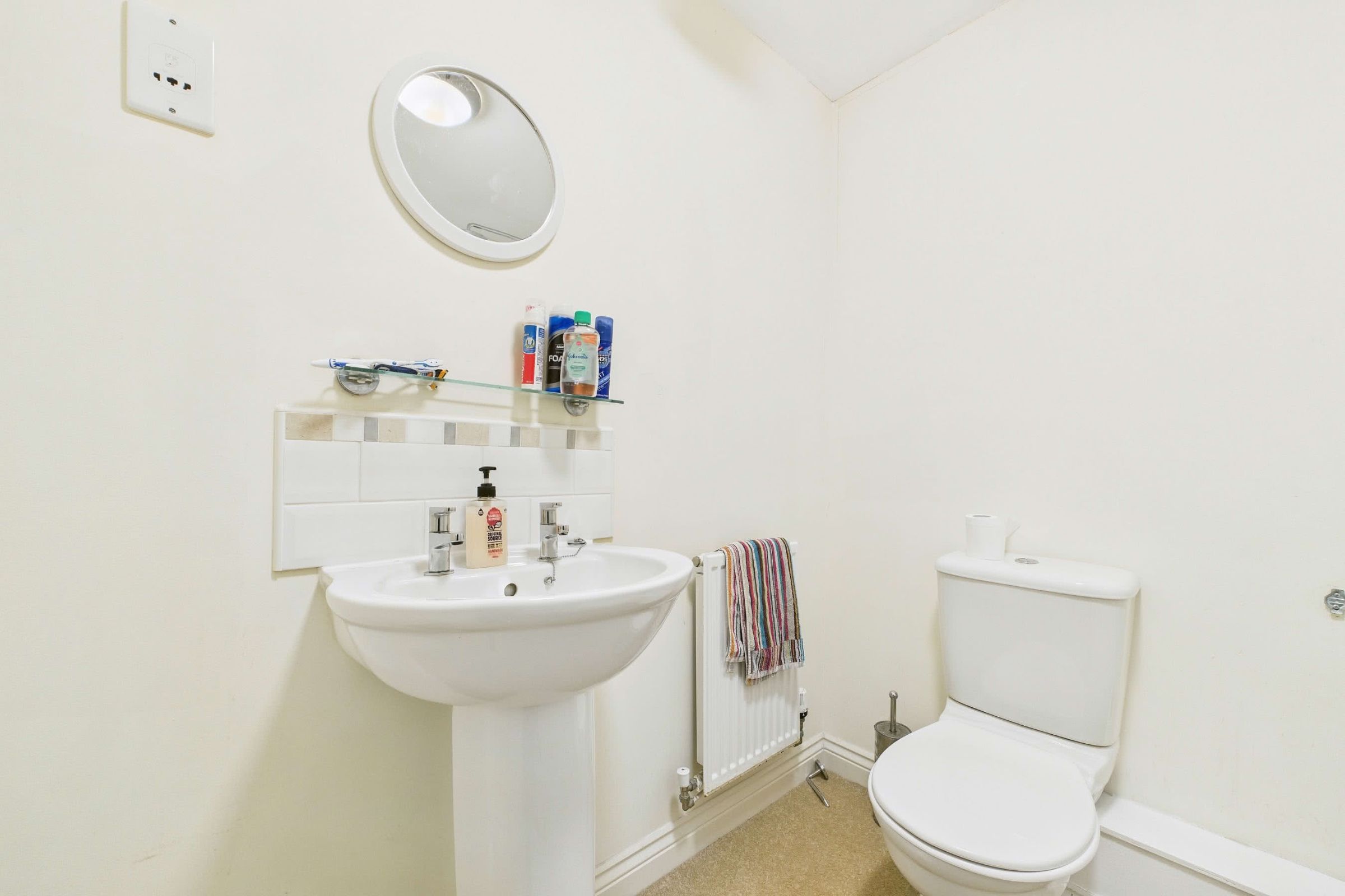 Conveniently positioned off the hallway, the cloakroom is fitted with a low-level WC situated beneath an obscured double-glazed window to the front aspect, providing natural light while maintaining privacy. There is also a pedestal wash basin with a tiled splashback, along with a central heating radiator. The room is laid with carpet, offering a soft, warm finish underfoot.