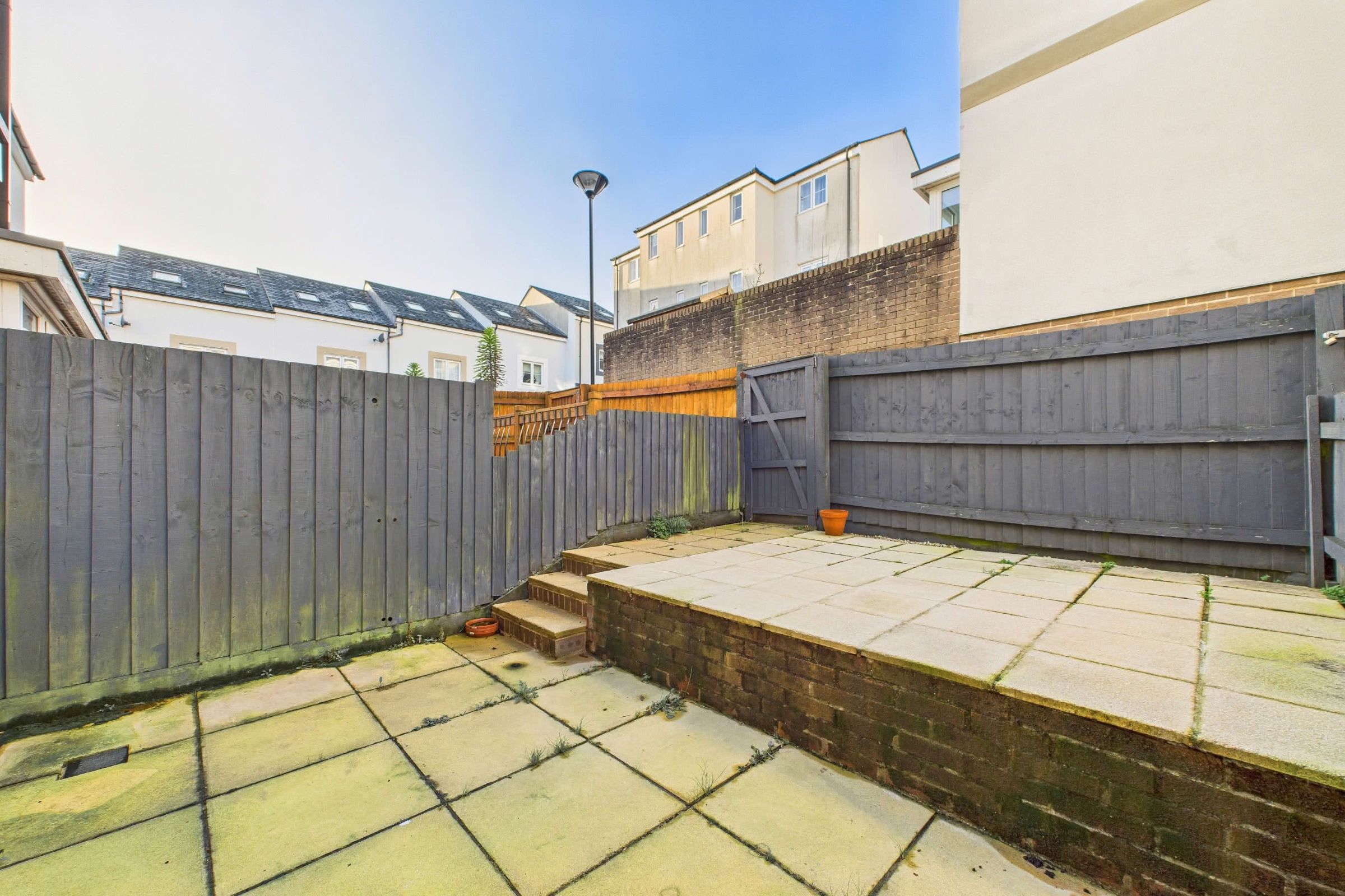 At the rear of the house is a neatly presented, paved patio area designed for minimal maintenance and ideal for outdoor seating. The space is enclosed by timber fencing, creating a secure and private setting. A gate to the rear opens onto the service path, providing convenient access through to the designated parking space.