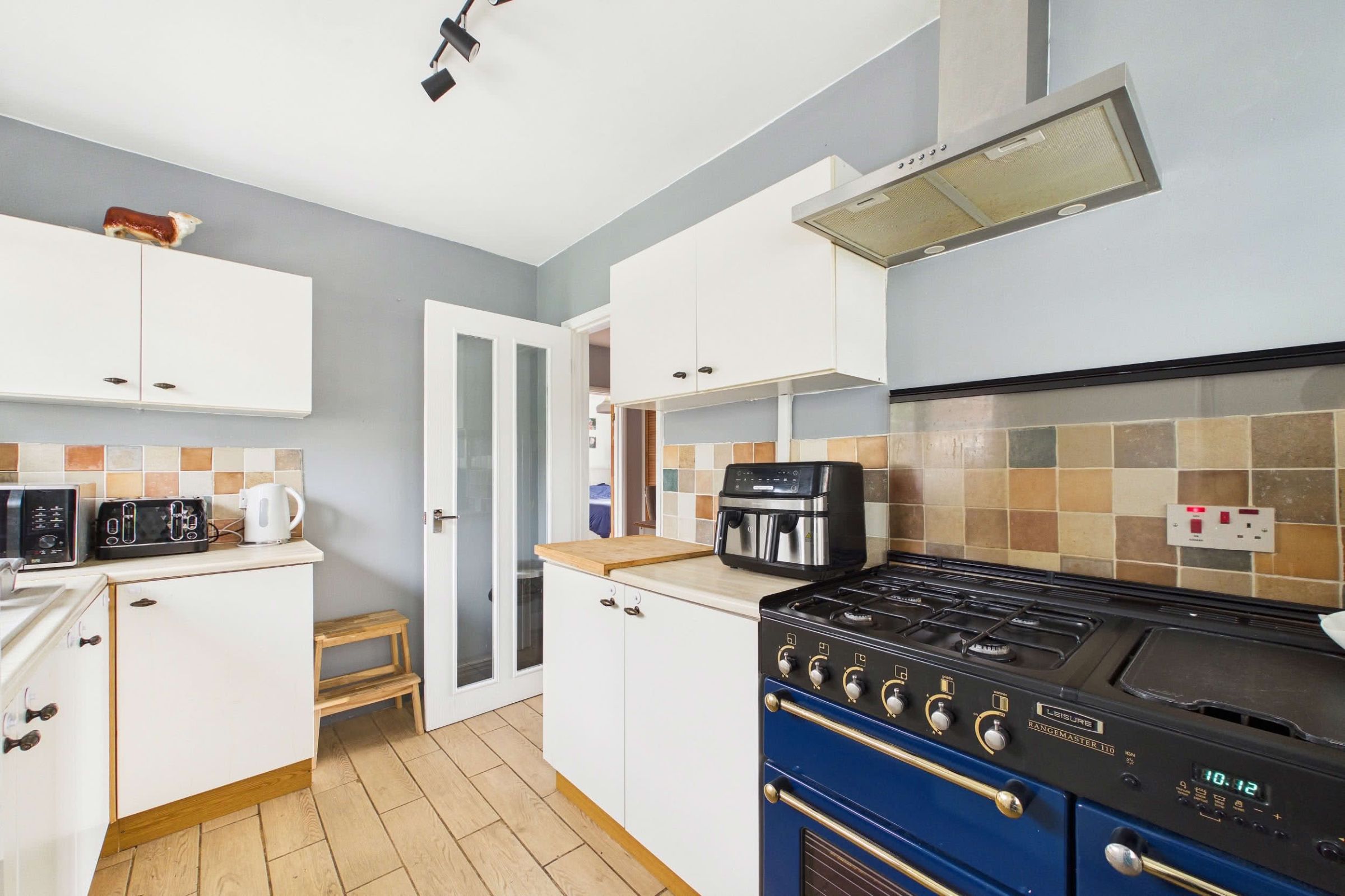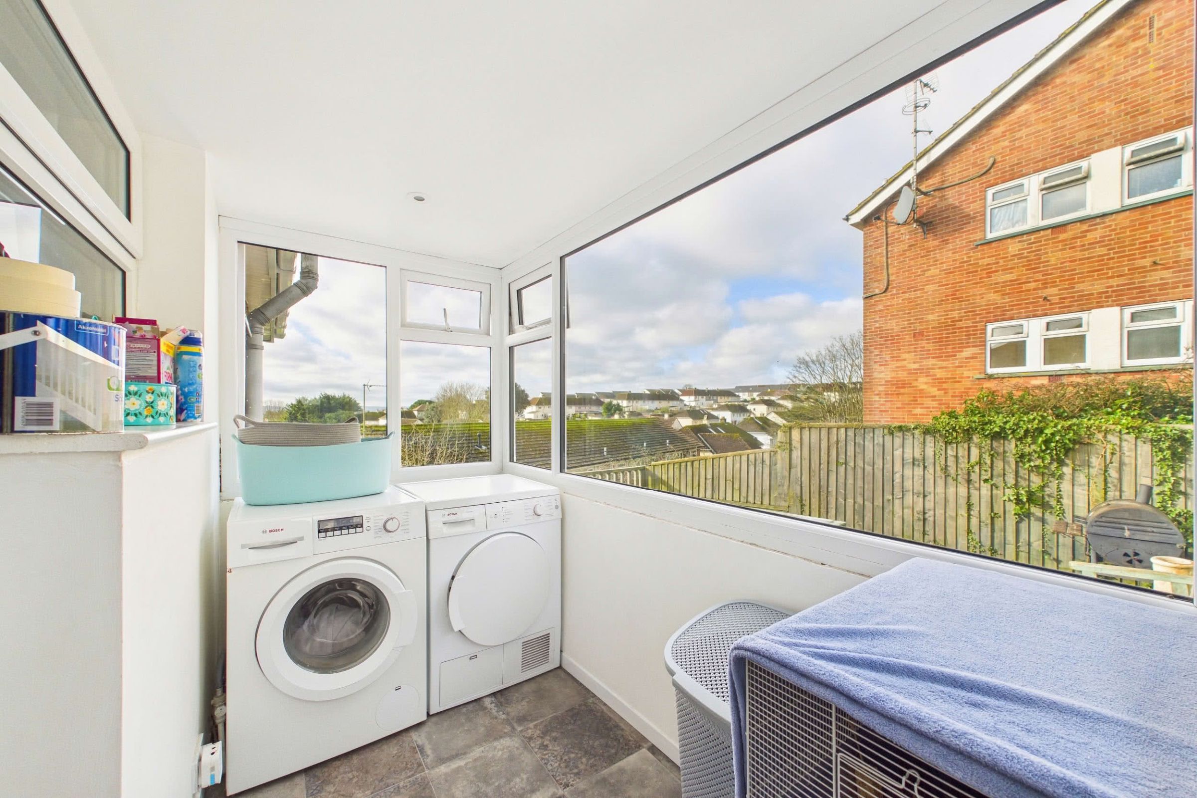 The kitchen is presented in a modern style, fitted with a coordinated range of wall and base units complemented by roll-edge work surfaces and tiled splashbacks. A ceramic one-and-a-half bowl sink with drainer is positioned beneath a double-glazed window overlooking the front, and the layout incorporates a Rangemaster-style cooker with an extractor hood above. Additional space is available for a freestanding fridge/freezer, while tiled flooring provides a practical finish. A UPVC double-glazed door opens into the utility room, which also offers a further access point to the front of the property. Bright and airy, the utility benefits from double-glazed windows on all sides and provides space and plumbing for both a washing machine and tumble dryer. Generous in size, it is ideal for laundry needs along with additional storage and day-to-day household tasks.
