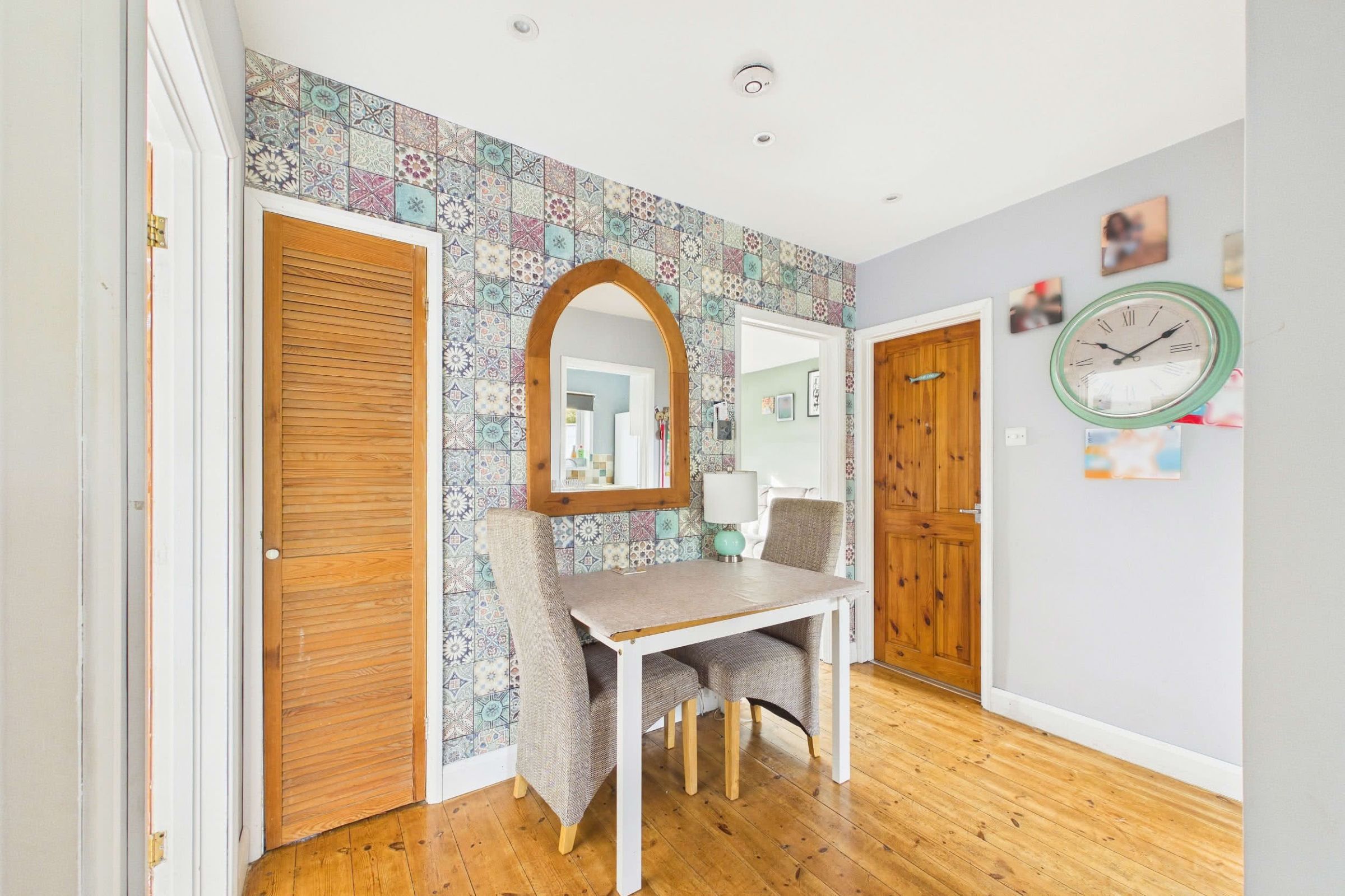 Accessed from the driveway via a timber gate, steps descend to the front garden and the home's main entrance. An enclosed porch provides an effective buffer from the outdoors before a double-glazed door opens into a generous reception hallway. The hall retains attractive original wooden floorboards and benefits from a central heating radiator and a built-in airing cupboard. With its excellent proportions, the space lends itself well to a cosy snug area, and the current owners comfortably accommodate a small dining table here.