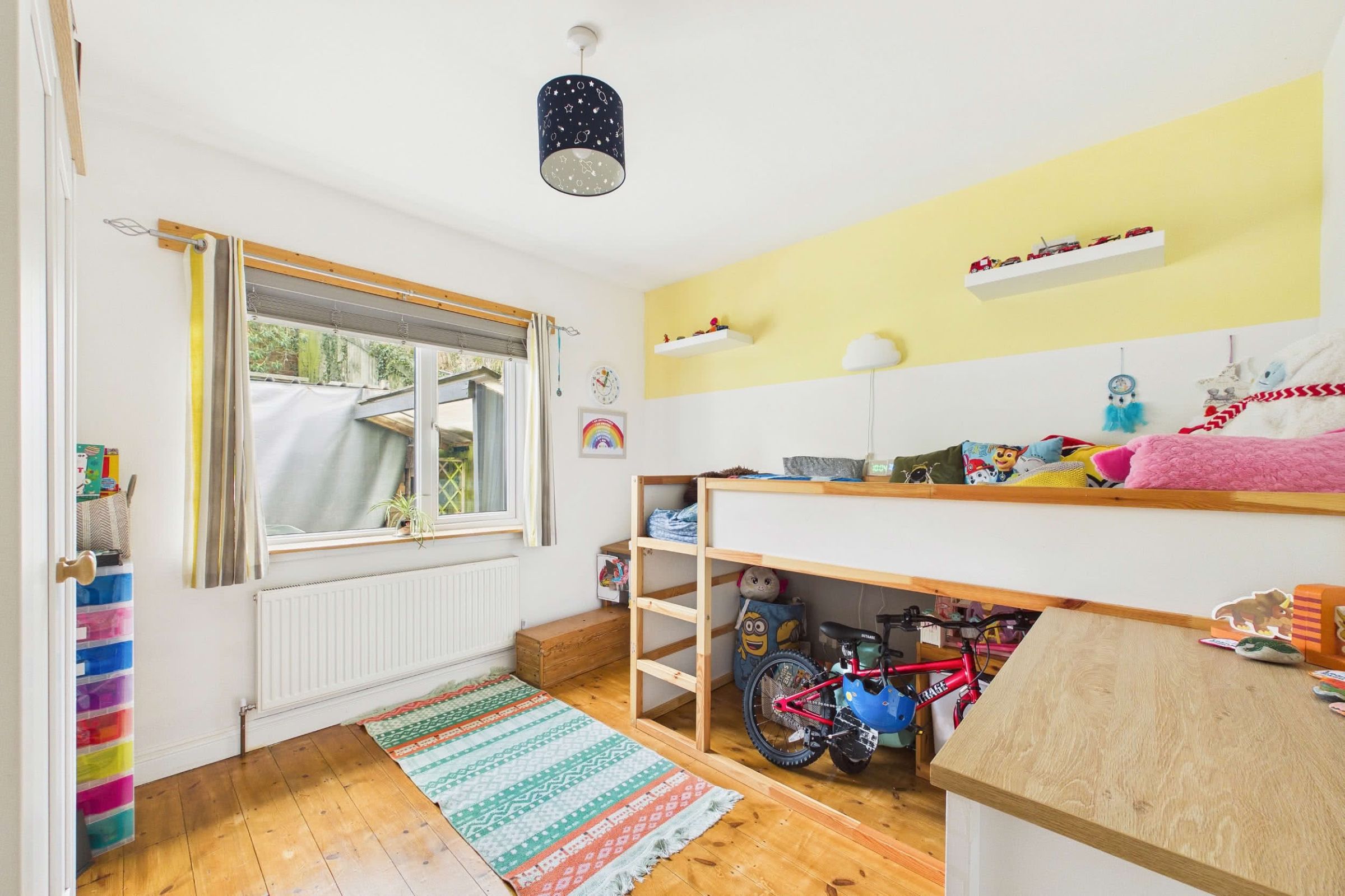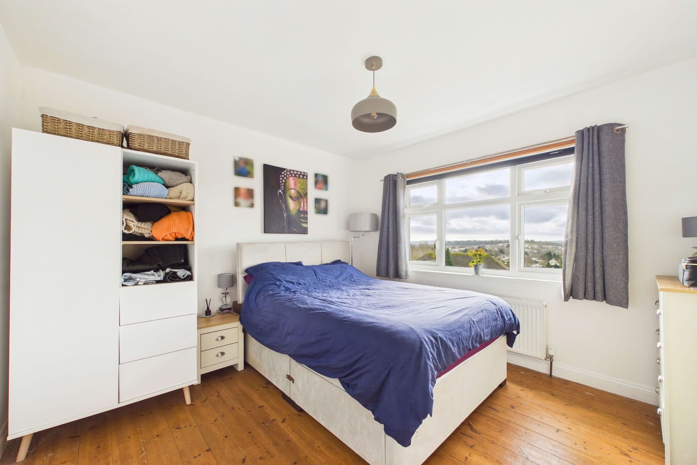 The property offers two well-proportioned double bedrooms, each retaining the original timber floorboards and benefiting from double-glazed windows and central heating radiators. The principal bedroom is further enhanced by a built-in cupboard, providing useful additional storage. The accommodation is served by a contemporary three-piece bathroom suite, comprising a panelled bath with mains-fed shower over, pedestal wash basin and low-level WC. An obscured double-glazed window provides natural light and privacy, while fully tiled walls and a wall-mounted heated towel rail complete the finish.