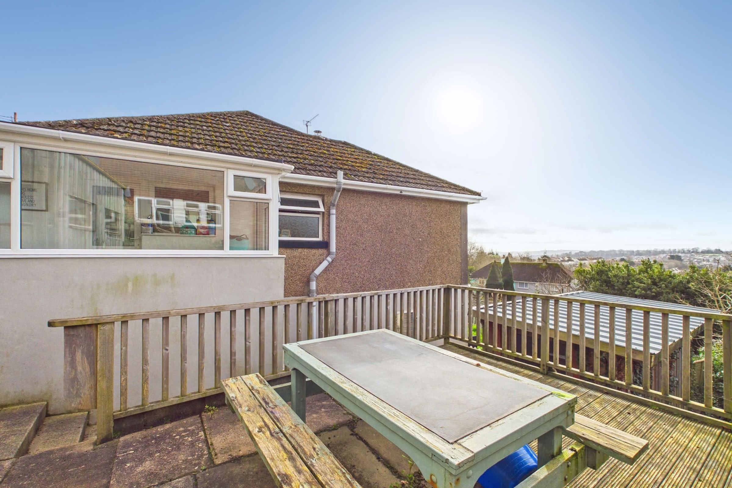 To the front, the property is approached via a block-paved driveway providing useful off-road parking, with an open outlook across the surrounding area. From here, the gardens wrap around the home, enjoying a desirable southerly aspect and offering a versatile arrangement of outdoor spaces. A series of patios and decked seating areas create ideal spots for alfresco dining and garden furniture. Steps lead down through a series of levels to areas of lawn, bordered by established planting and enclosed fencing for privacy. There is ample room for storage with space for sheds and practical garden equipment. The garden also provides access to the basement, currently utilised for storage but offering excellent scope for conversion, subject to the necessary consents.