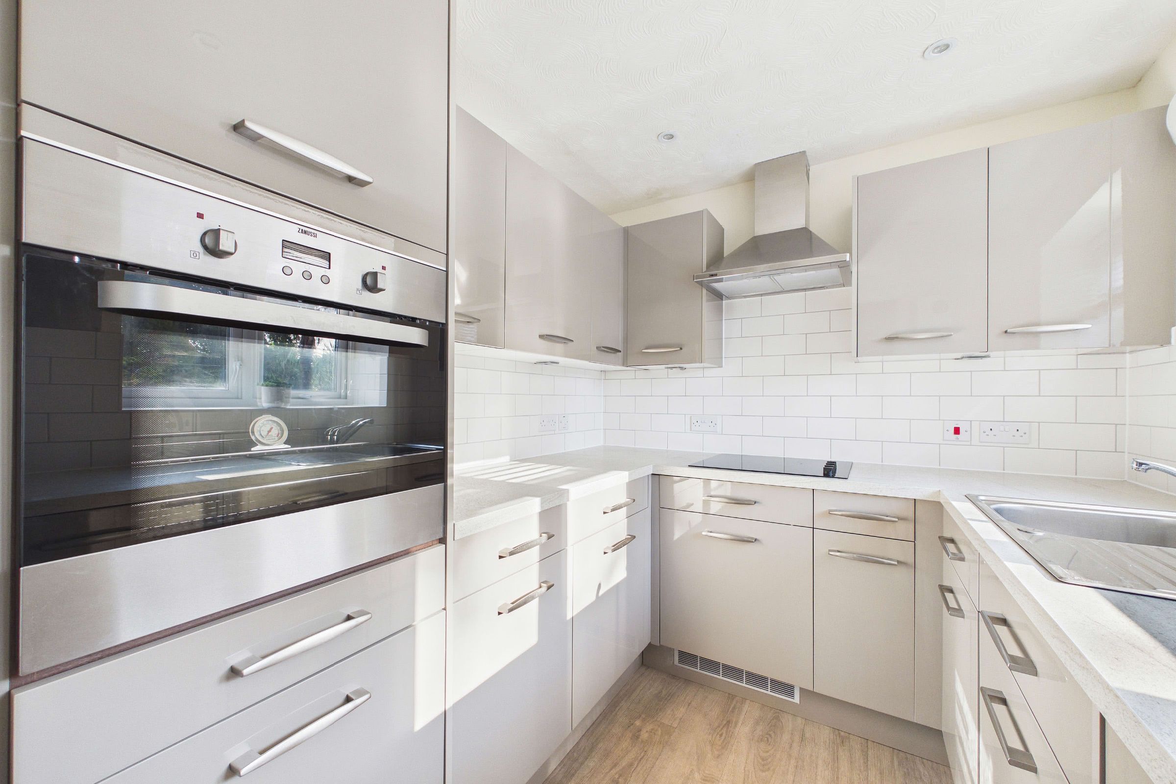 The kitchen is fitted with a contemporary range of matching wall and base units, complemented by square-edged work surfaces and a tiled splashback for easy maintenance. A stainless-steel sink with drainer is positioned beneath a double-glazed window, enjoying a pleasant outlook over the communal gardens. Integrated appliances include an under-counter fridge and freezer, a washing machine, an eye-level oven, and an inset electric hob with an extractor hood above, creating a smart and practical space for everyday use.
