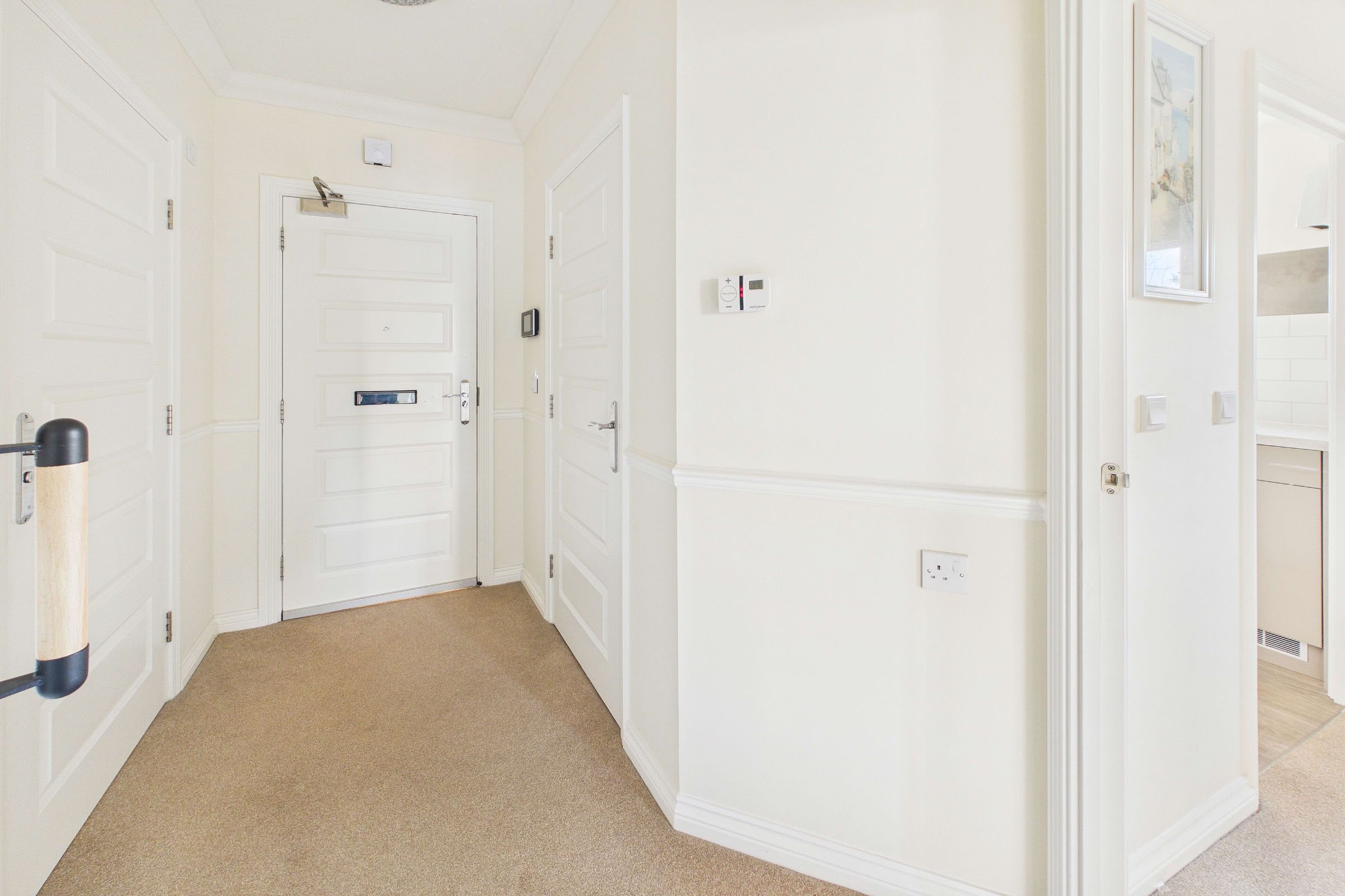 Accessed via the secure communal entrance on the ground floor, the apartment is reached along the well-maintained communal corridor. The private front door opens into an inviting entrance hall, featuring a wall-mounted video entry system and thermostat controls. A useful built-in storage cupboard, complete with internal lighting and fitted shelving, provides practical space and also houses the utility meters and consumer unit.