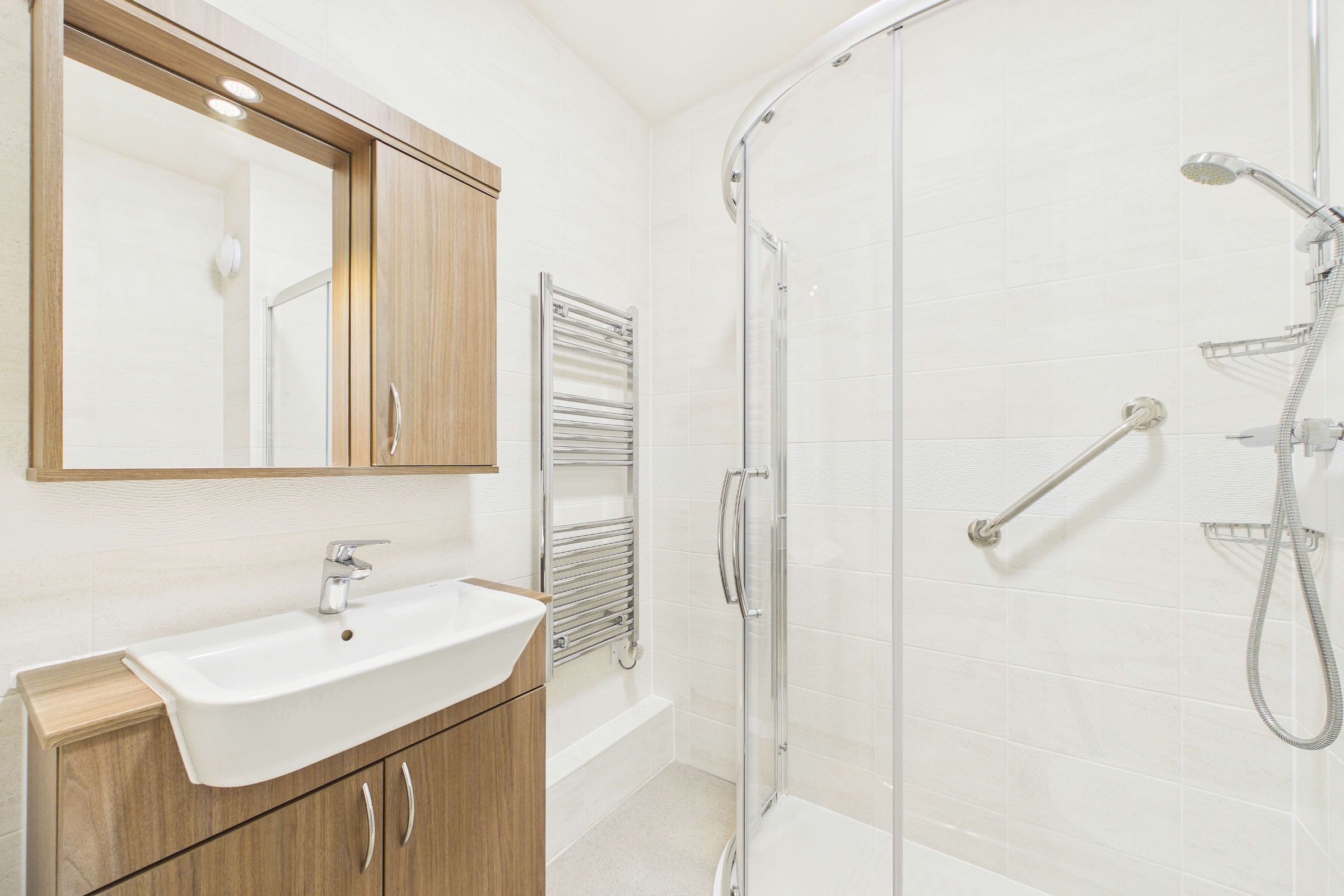 A stylish, modern three-piece shower room finished with fully tiled walls. The suite includes a double corner shower enclosure with a mains-fed shower and a supportive wall-mounted handrail. A vanity unit with inset wash basin provides useful storage, complemented by a mirrored cabinet incorporating a cupboard and downlight. Further features include a concealed-cistern WC and a wall-mounted heated towel rail, completing the room's contemporary feel.