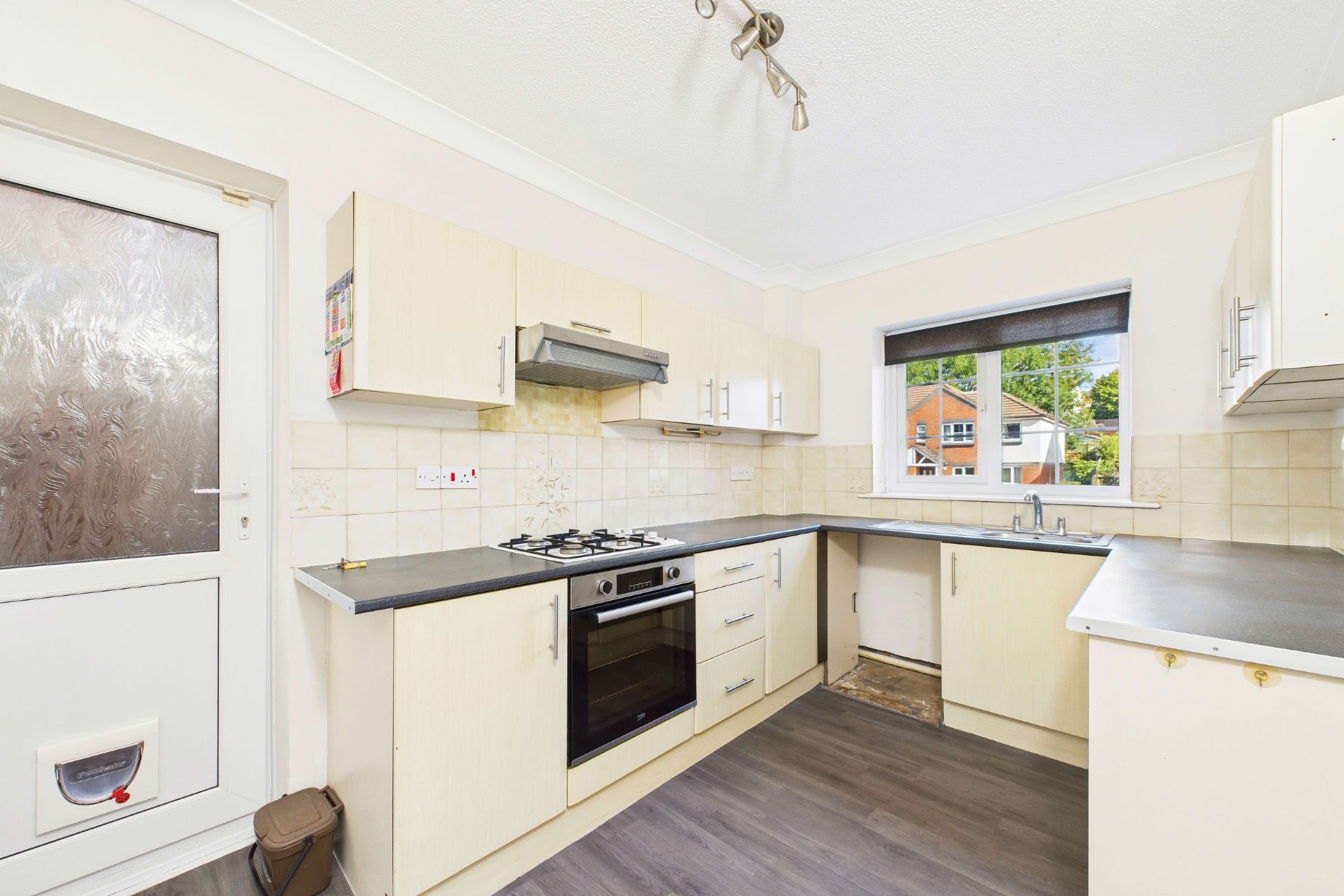 The kitchen is fitted with a range of wall and base units, complemented by roll-edge work surfaces and tiled splashbacks. A stainless steel sink and drainer is positioned beneath a double-glazed window enjoying a front aspect outlook. Integrated appliances include an electric oven with a countertop gas hob above, complete with extractor hood. There is space and plumbing for a washing machine, while a serving hatch provides convenient connection to the open-plan living and dining room. An opaque double-glazed door gives access to the side of the property, leading conveniently through to the rear garden.Living & Entertaining