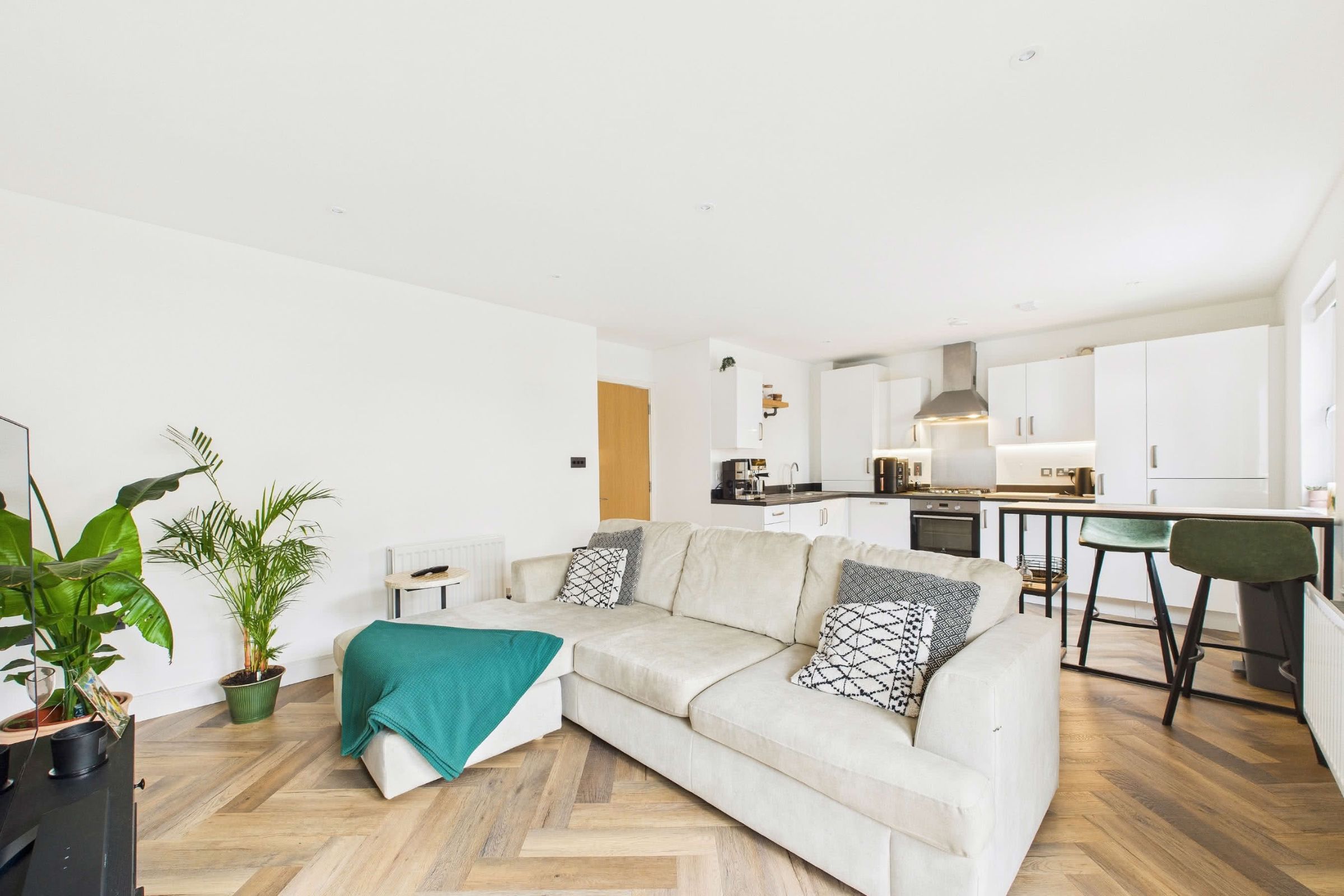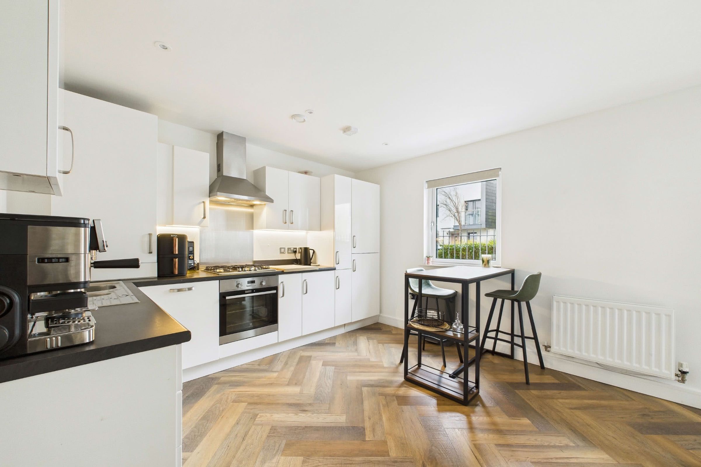 The stylish open-plan reception and kitchen area is laid with the same hard-wearing LVT flooring as the entrance hall. The living room space offers comfortable everyday living and enjoys natural light via double-glazed patio doors that open directly onto the terrace. Two central heating radiators serve this area, ensuring it remains warm and inviting throughout the year. The contemporary fitted kitchen is presented with white wall and base units, complemented by roll-edge work surfaces and discreet under-cupboard lighting. It includes a one-and-a-half bowl stainless steel sink and drainer, together with an extensive selection of integrated appliances comprising a washing machine, dishwasher, fridge/freezer, oven and a surface-mounted gas hob with extractor hood above. The gas-fired combi boiler is housed within the matching cabinetry for a tidy appearance. There is also space within the kitchen area to accommodate a dining table adjacent to a double-glazed front-facing window.