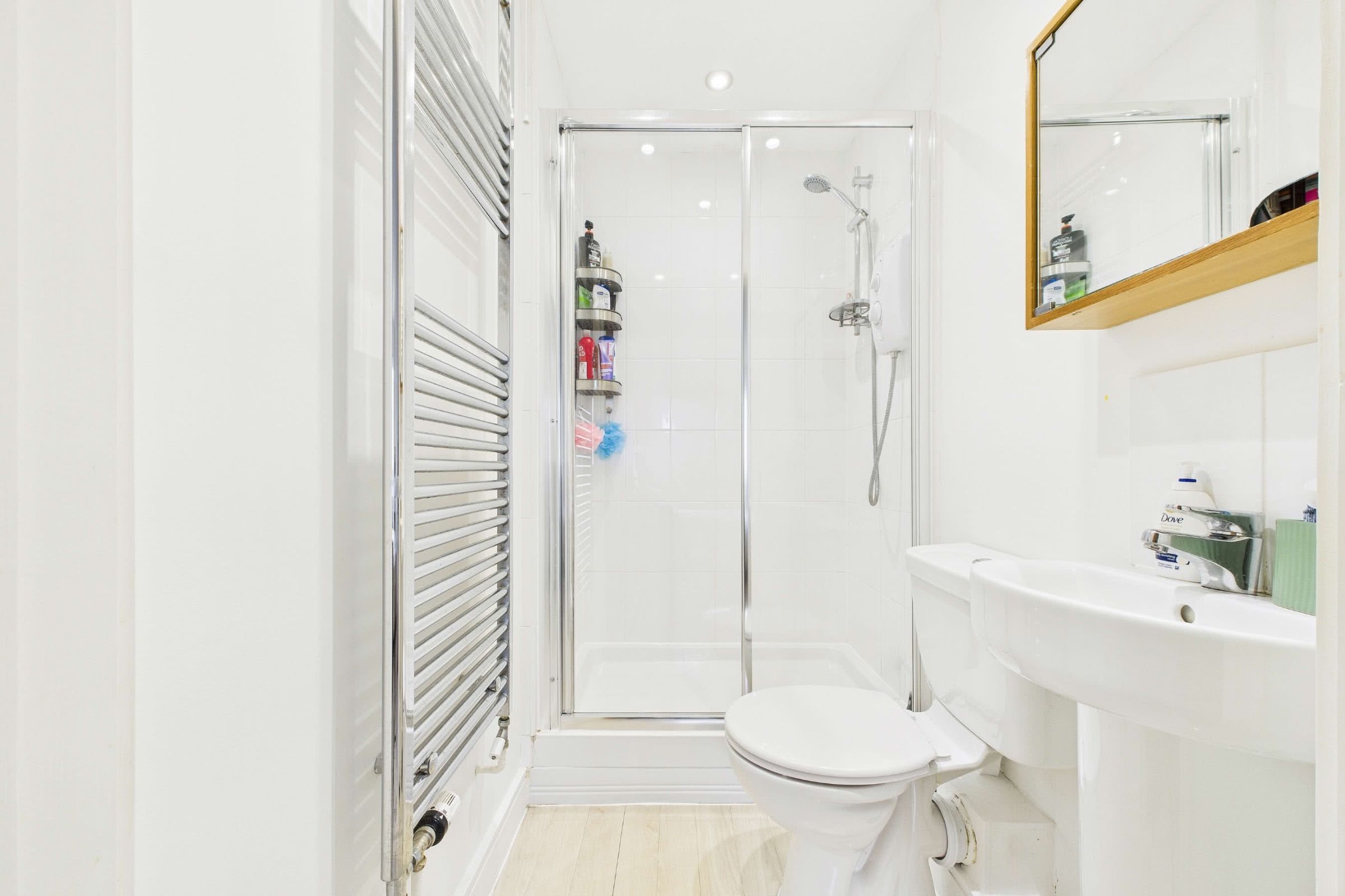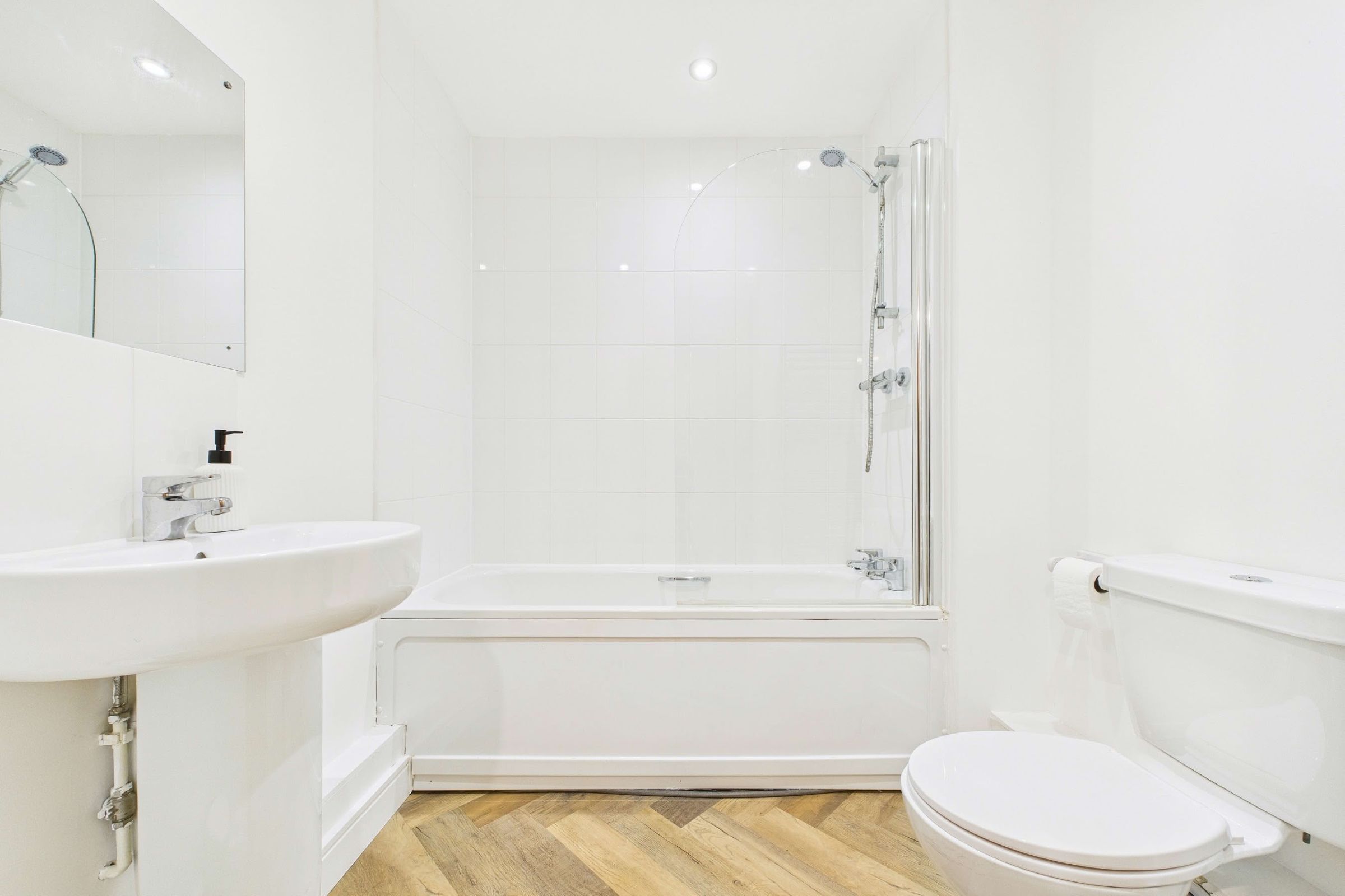 The apartment offers two double bedrooms, with the principal bedroom further enhanced by an en-suite shower room. The principal bedroom enjoys a double-glazed window to the side aspect and a central heating radiator. Its contemporary three-piece en-suite comprises a generous shower cubicle with tiled wall surround and electric shower, low-level WC, pedestal wash basin with splashback and a wall-mounted mirrored cabinet above. A wall-mounted heated towel rail completes the en-suite arrangement. The second bedroom is a smaller double and is currently utilised as a dressing room. It also benefits from a double-glazed side window and a central heating radiator. Completing the accommodation is a modern three-piece family bathroom, fitted with a bath with mains-fed shower over and tiled surround, pedestal wash basin, low-level WC and wall-mounted heated towel rail. The bathroom is finished with durable LVT flooring, providing style and practicality.