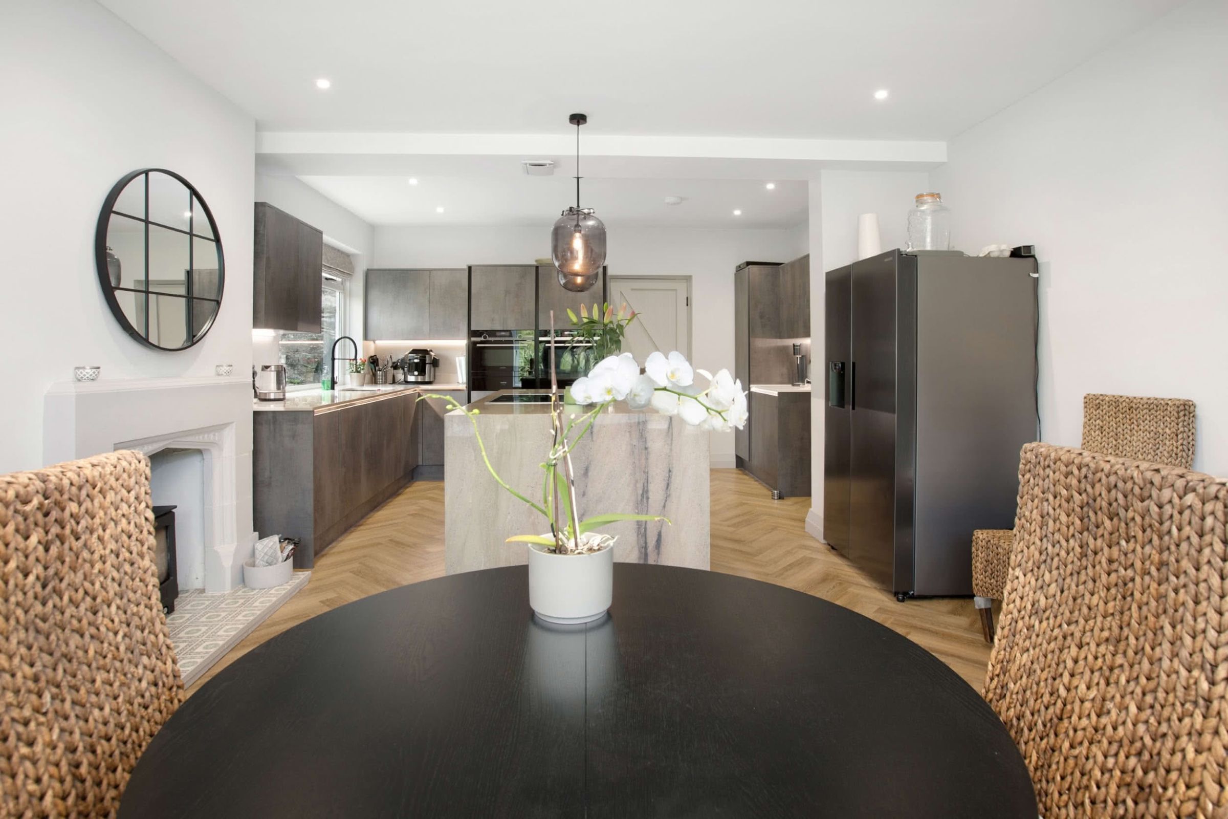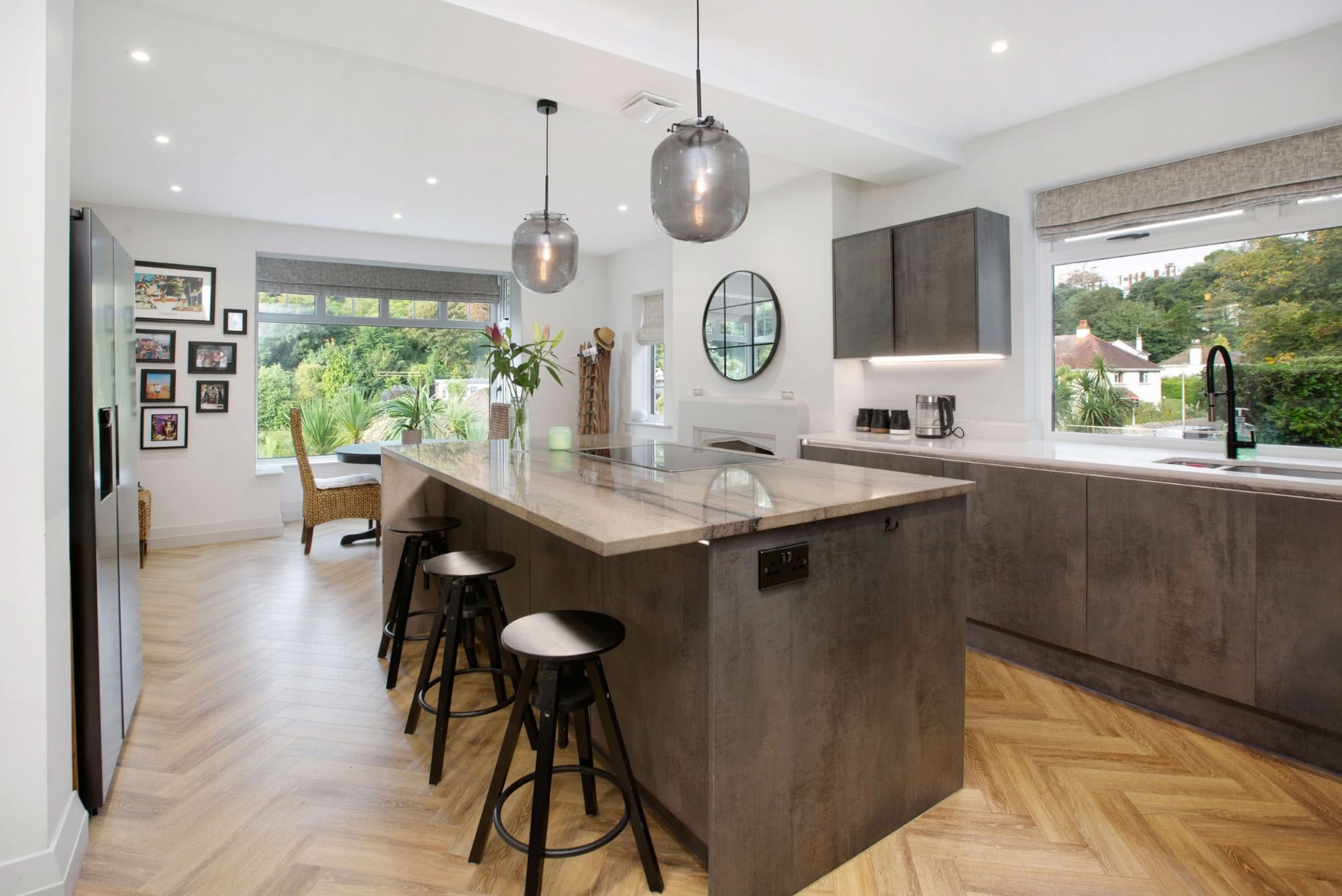 The property is entered via a welcoming reception hall, finished with herringbone Amtico flooring which continues through much of the ground floor. To the front, the principal reception room is bright and generously proportioned, enjoying an elevated outlook through a bay window and direct access via folding doors to the side garden and patio, creating an excellent connection between the indoor and outdoor spaces.
